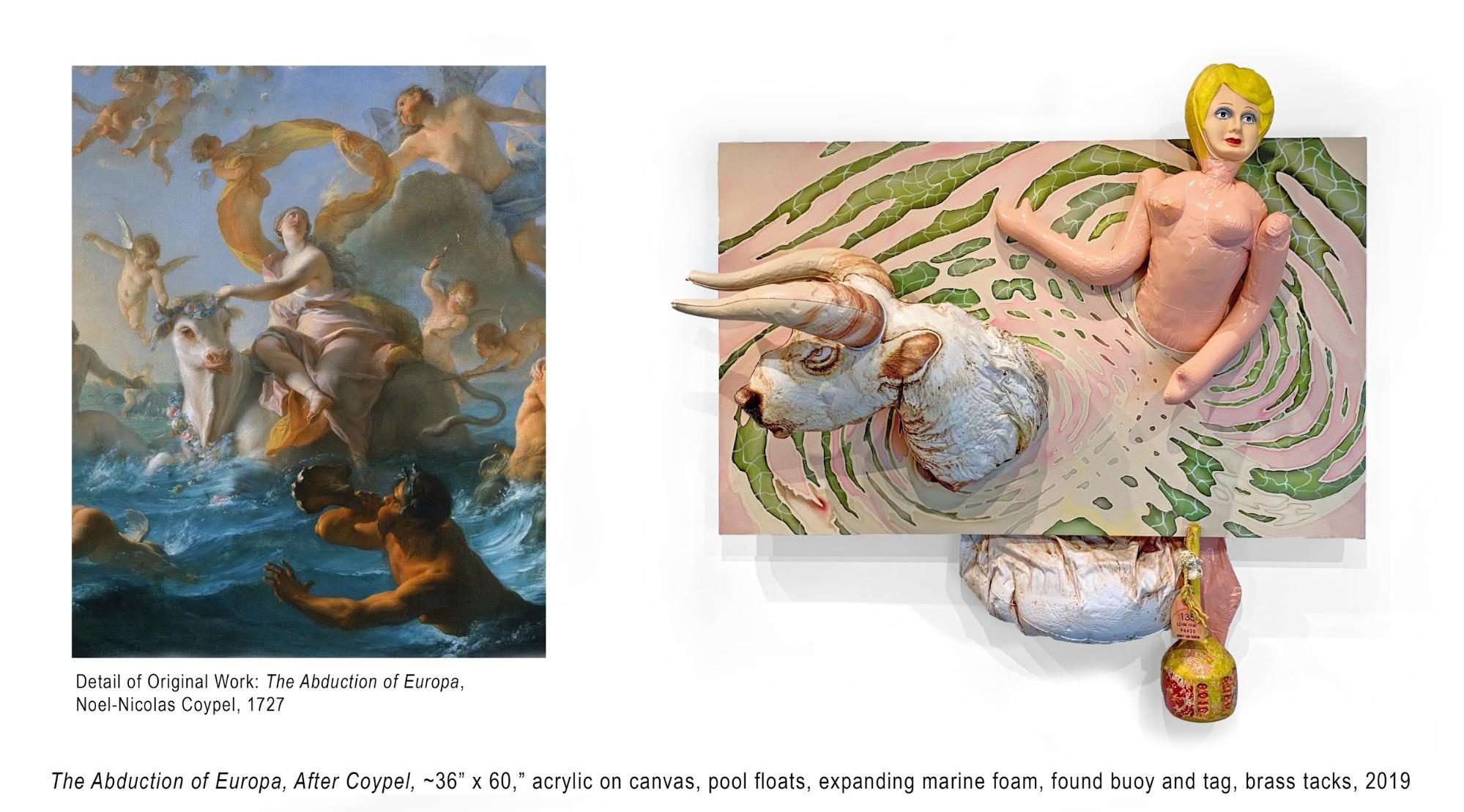 This one is referencing Noël-Nicolas Coypel’s Abduction of Europa. In the story, Zeus disguises himself in the form of a white bull and lures Europa onto his back to then drag her into the sea and have his way with her. There’s so much weighted symbolism to draw from this painting. I think about the bull on Wall Street, the economy, and certain capitalistic mechanisms, it’s a symbol for that. But then going further, I think of the significance of it being this godly white bull representing the baggage that comes from a society that built itself in service of white patriarchy.