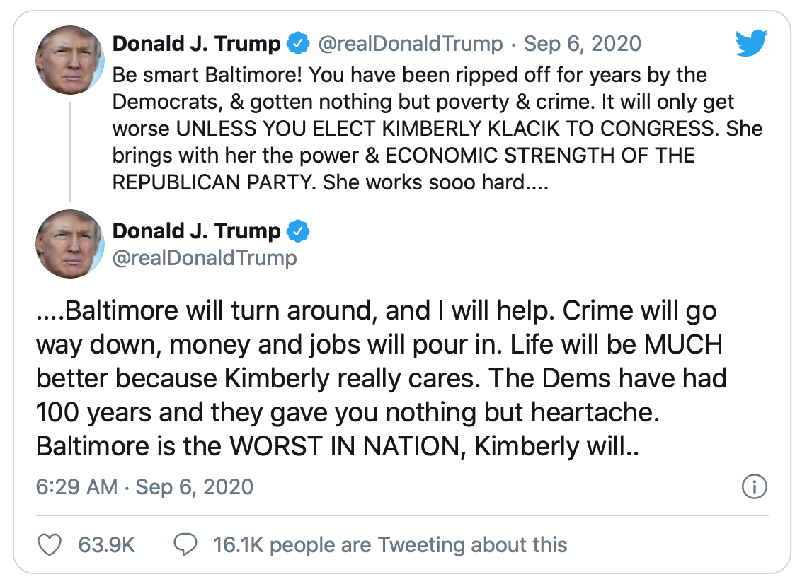 The Republican incumbent in the White House is taking aim at a Democratically controlled city while endorsing the Republican candidate for Maryland’s 7th Congressional District, Kimberly Klacik. She’s running to unseat Democratic Rep. Kweisi Mfume, who won the seat in a special election in April after the death of Rep. Elijah Cummings.
