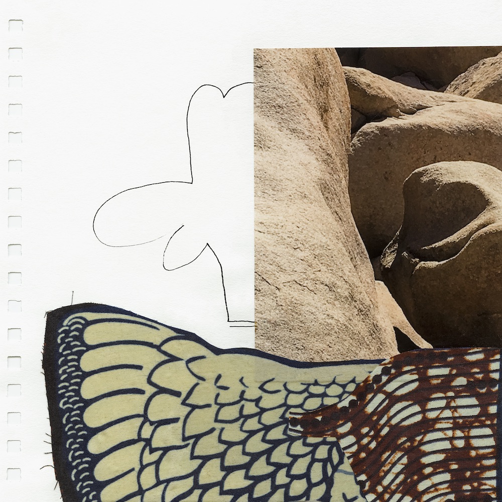 Jo, whose faculty for visual poetry is matched by her perceptive and radiant use of language, had produced an artist’s book. Although it shares its biographically evocative title with the BMA show, the book features collages that have inspired a series of prints now on view in the exhibition Jo Smail: Bees with Sticky Feet at Goya Contemporary Gallery, which published the volume. At a time when many familiar sources of connection and comfort have been cut off, quietly turning Jo’s thoughtfully composed pages has been therapeutic, particularly because the volume addresses the ways in which she has met adversity and flux with unstoppable creativity and an unflinching capacity to love.