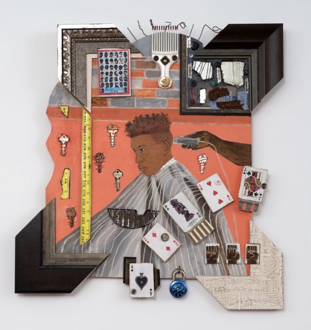 For artist Schroeder Cherry, message is synonymous with materials. On display in February at the Gallery at Baltimore City Hall, Cherry’s assemblage paintings combine wooden bits and painted portraits with common everyday household items like keys, playing cards, dice, and combination locks. His solo exhibition, Barbers and Porters: Pillars of the Community, drew parallels between these two unique Black American occupations, where hospitality, attention to detail, and a devotion to one’s craft has manifested in stability and strength within the Black community, both historically and in the present. On opening night, Cherry’s show broke all sales records for exhibitions at City Hall, the red dots proliferating across the walls a testament to a long and well-respected career in the arts.