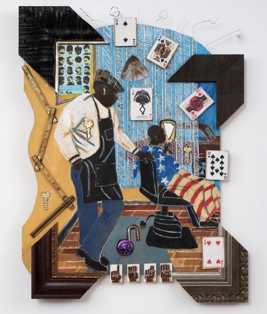 Through evocative, material-laden storytelling, Cherry challenges conceptions of American history, as well as traditional divisions between art and craft, where functional materials like wood, fiber, repurposed hardware, and household objects are combined into dimensional paintings, scenes that feel purposefully decorative but also mysterious in the way that they ask questions of the viewer. Each of Cherry’s assemblage portraits creates a sense of familiarity, especially through the everyday objects and materials he repeatedly incorporates as symbols for larger questions and preconceived notions of American history and culture.