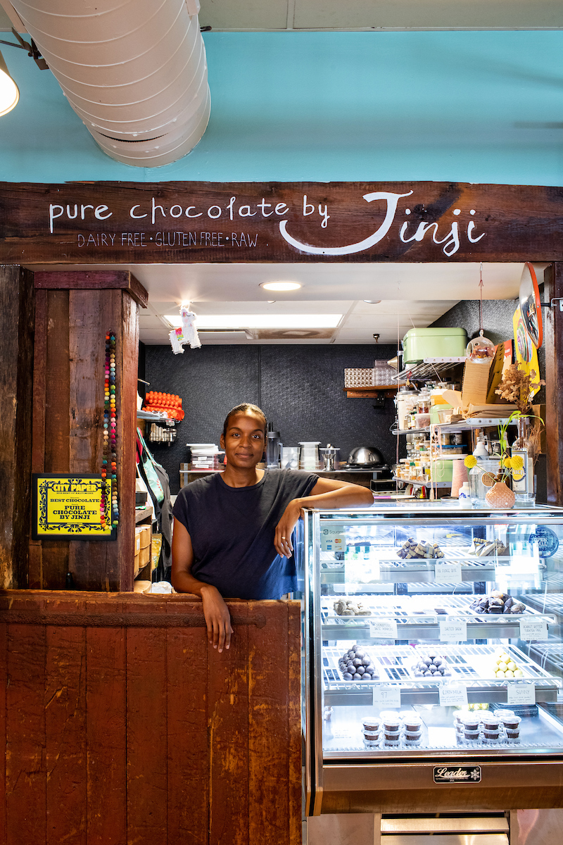 Jinji Fraser doesn’t love eating chocolate. Don’t get her wrong: She likes it, but it’s not her desert island food. Her interest in chocolate lies more in its history, which is ancient, and the neverending iterations of savory and sweet she can create with it. She’s had a reverence for the confection since a fateful day in 2012 when, while working an event as a nutrition consultant, she stepped on a postcard advertising chocolate-making classes. Only a month or so later she was starting the business that became Pure Chocolate by Jinji with her father, Guy Fraser.