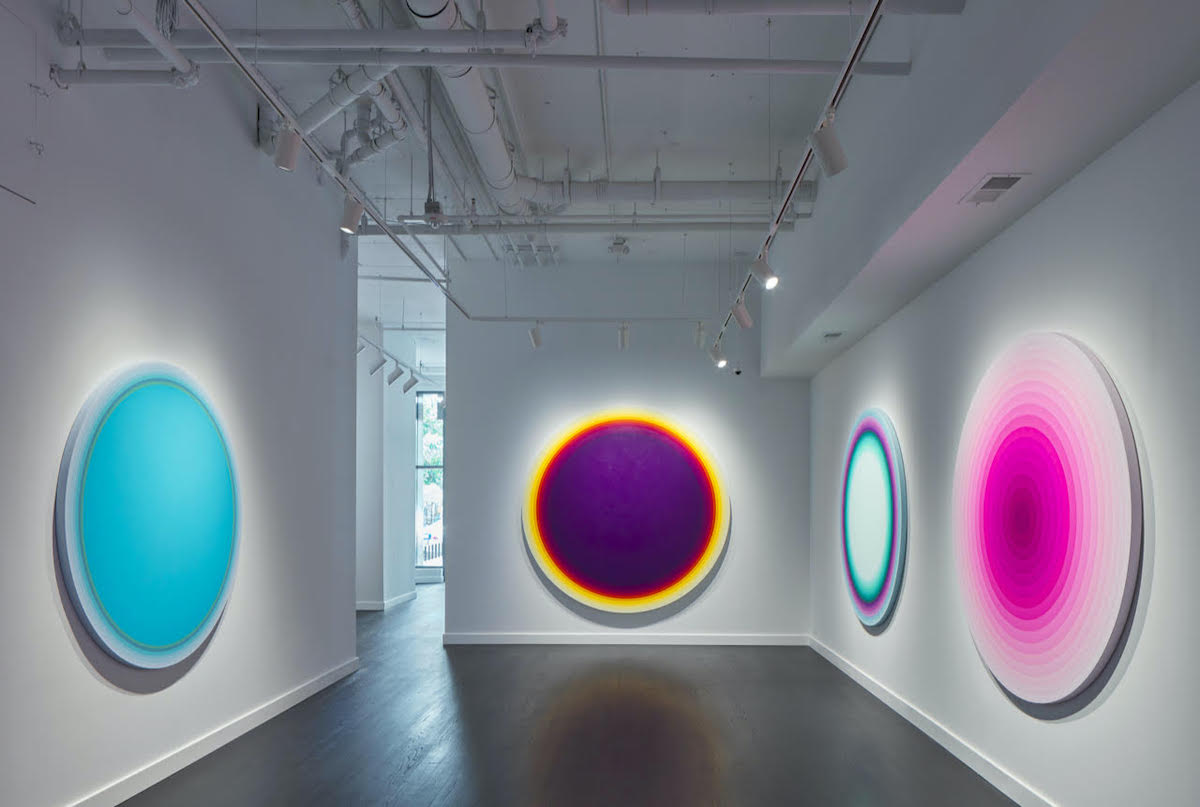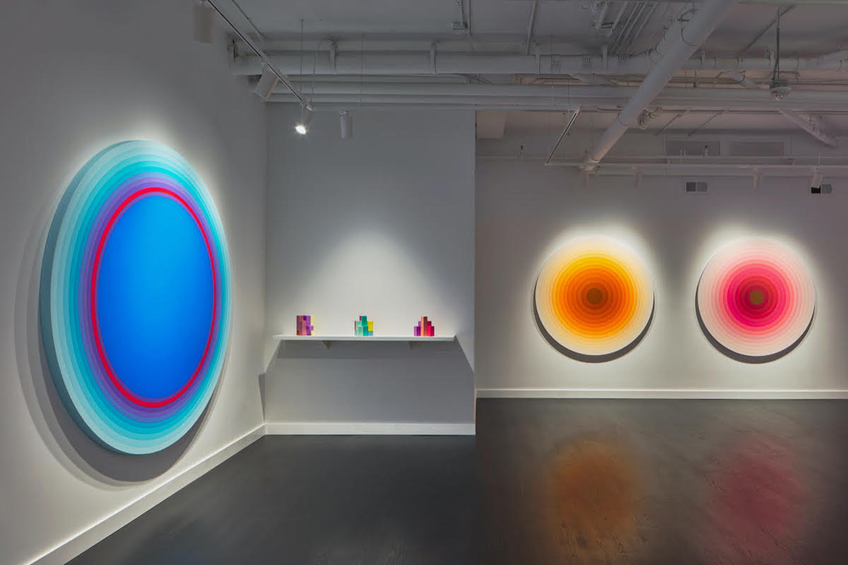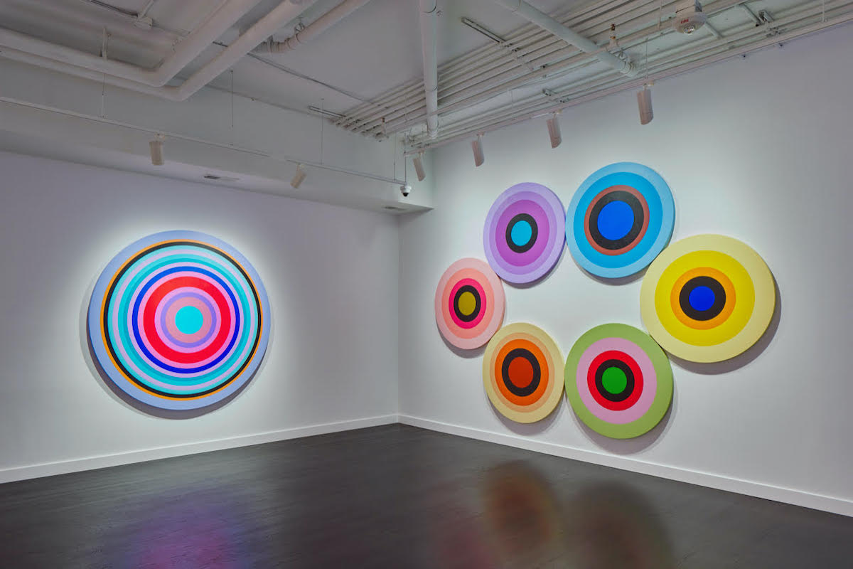 This exhibition, which closed in August, offered a plethora of works, including a series of sumptuous, large-format circular paintings that comprised the heart of the show. Also presented were smaller tondos rather arbitrarily grouped on the wall in spacious ovoid configurations, as well as modular, toy-like block sculptures, an addendum to an otherwise focused show. Adding to this work were digital prints that coupled the artist’s concentricities of color with a didactic line-up of constituent colors. So much diverse work in one show, while indicative of Lu’s prolific creative output, risked being a distraction from the premiere works of this exhibition, but offered a subtext for the artist’s thought process.