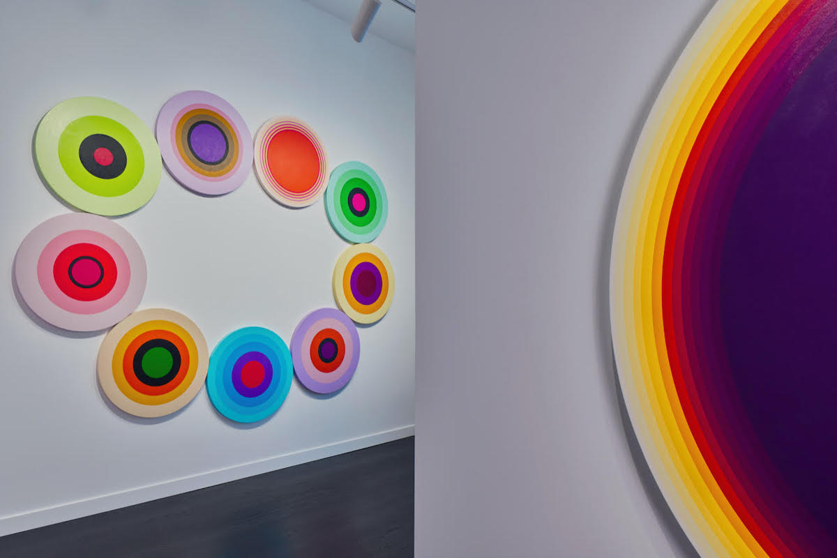 Lu’s complex, anthropometric tondos, measuring about five to six feet in diameter, were the strongest works in this exhibition, urging a sentient, mesmerized viewer to align bodily with their magnetic, centrifugal power. They are arresting in their complexity, centering in their universal circularity, and they induce mandala-like, bodily meditation. Highly charged with radiating energy, these fields of immaculately painted spectral color bands are arranged variously with diverse widths, intervals, and interstices that accommodate the sphere of the human eye, as philosophized by Emerson in his essay on circularity.