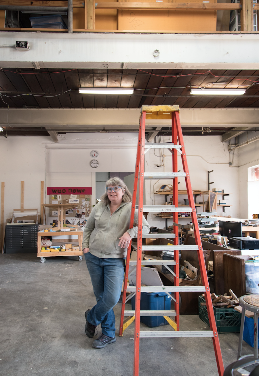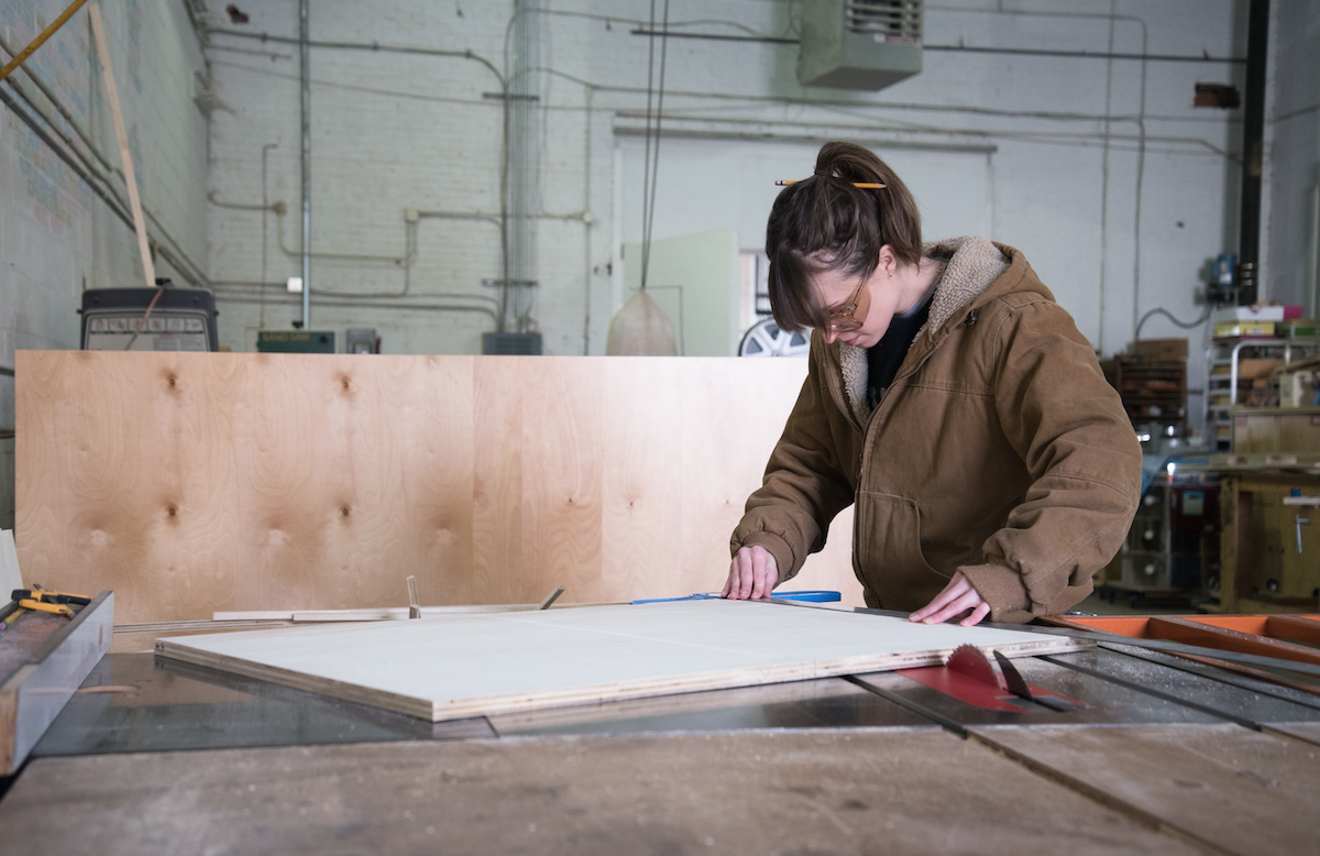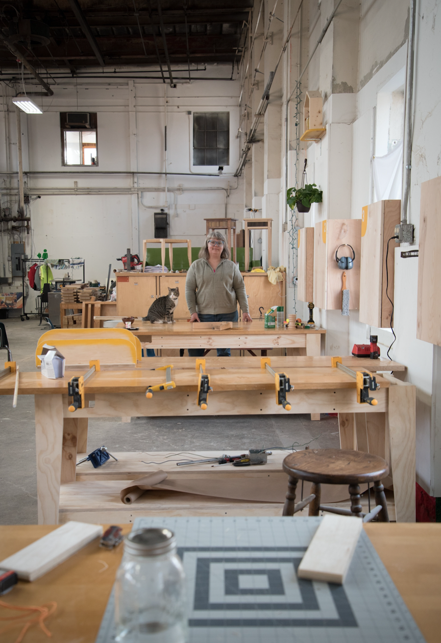 The widespread alienation, harassment, and unmitigated exclusion that comes with not being a man in a typically hyper-masculinized field prompted Marriage to develop a necessary alternative. With support from a John D. Mineck Furniture Fellowship grant, she developed a woodshop specifically for women and gender-nonconforming craftspeople to work and learn new skills. In 2017, Marriage opened the shop doors in Baltimore’s Woodberry neighborhood, naming the space A Workshop of Our Own (or WOO)—a nod to Virginia Woolf’s canonical essay which points to the material and social limitations that have impeded women’s ability to thrive creatively throughout history.