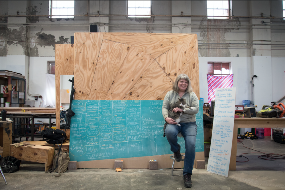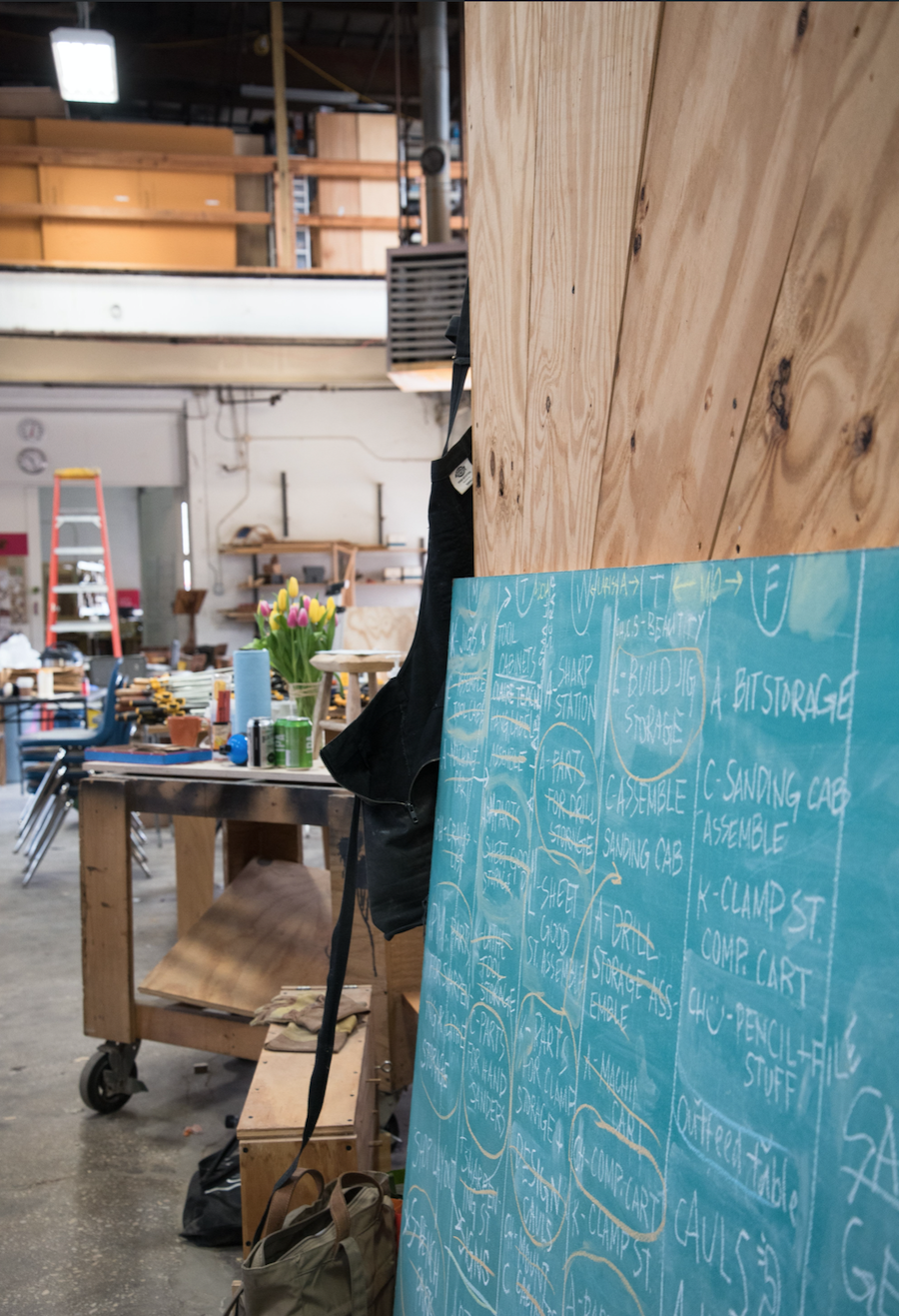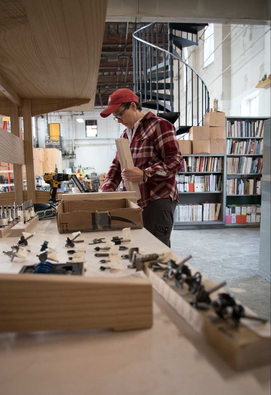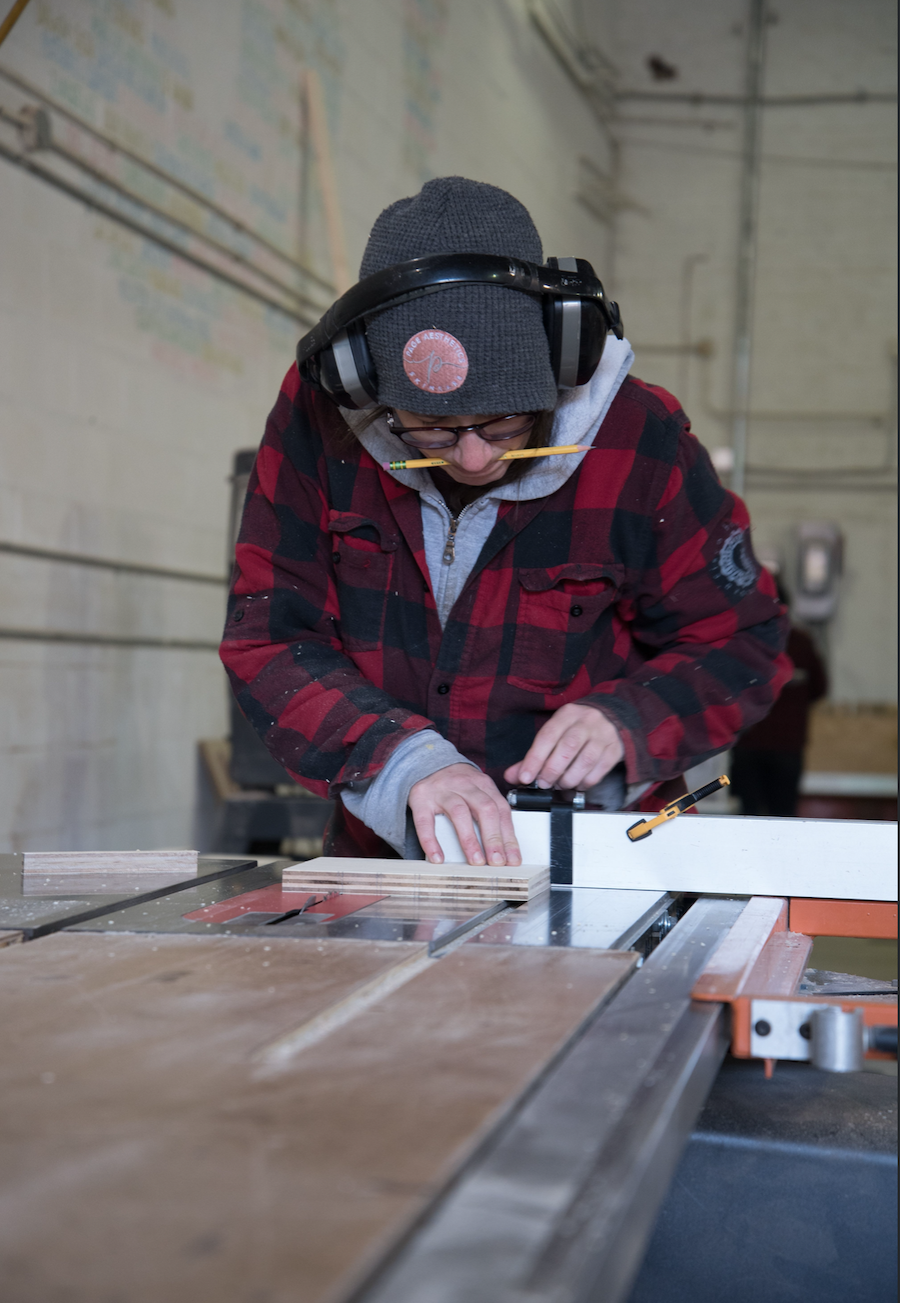 The widespread alienation, harassment, and unmitigated exclusion that comes with not being a man in a typically hyper-masculinized field prompted Marriage to develop a necessary alternative. With support from a John D. Mineck Furniture Fellowship grant, she developed a woodshop specifically for women and gender-nonconforming craftspeople to work and learn new skills. In 2017, Marriage opened the shop doors in Baltimore’s Woodberry neighborhood, naming the space A Workshop of Our Own (or WOO)—a nod to Virginia Woolf’s canonical essay which points to the material and social limitations that have impeded women’s ability to thrive creatively throughout history.