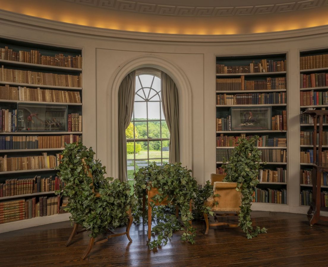 According to Amussen, the Art in Our Gardens program began several years ago to encourage regional sculptors to display contemporary works in the wildflower meadow and other areas in the gardens. Artists John Ruppert and David Hess have exhibited as part of the program in the past. For her show, Amussen created three new large-scale, site-specific works that respond to the architecture, gardens, and history of Ladew Topiary Gardens and conducted research in its Oval Library, where director Emily Emrick pointed out a sprig of ivy that was creeping through the grate on the floor. That single detail became the impetus for two of Amussen’s works created for her solo exhibition, Flourish.