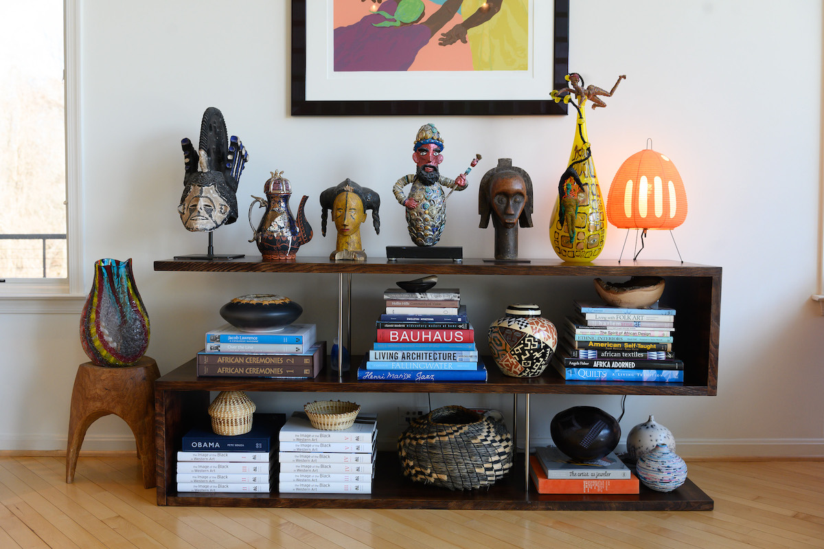 On her desk is a Lorna Simpson mixed-media piece featuring a small, felt-lined wooden box that contains ceramic, rubber, and bronze wishbones. The shelves above her desk house rows of books ranging from contemporary art and photography to history, biographies, and artist books. A few frames sit in a row on the floor, waiting for open wall space: a Roy DeCarava print, an early painting by Shinique Smith, a work by the late David Driskell.