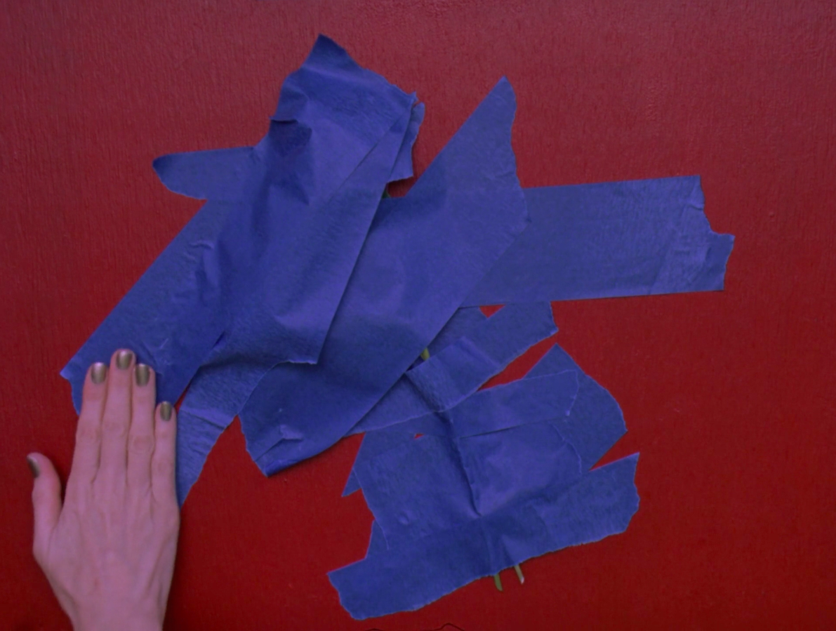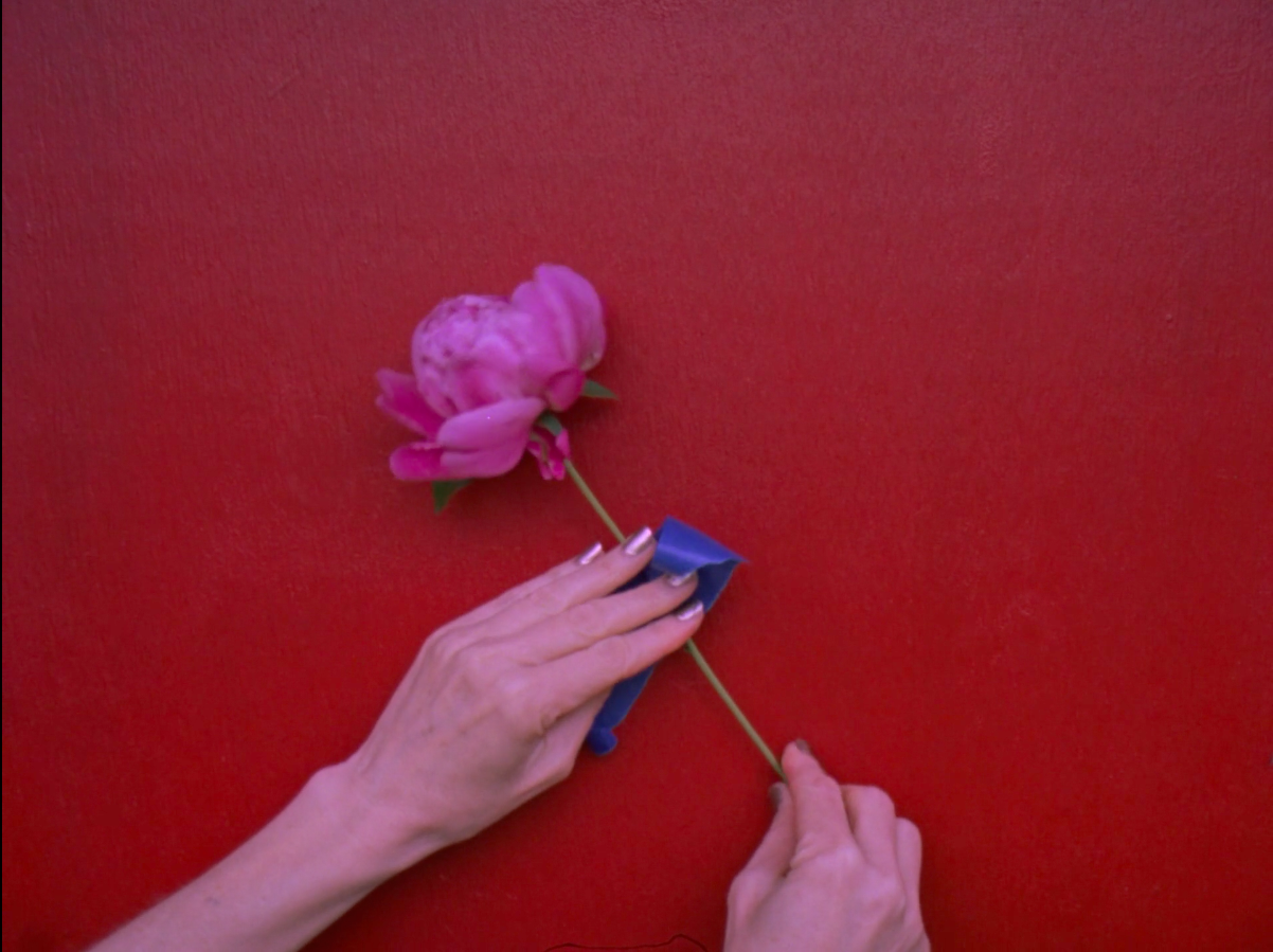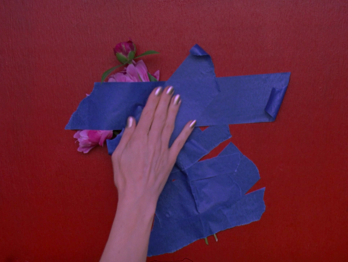 Stems already secured to the wall, the flower blossoms are next. Wind blows the petals gently before the hand tapes over them. A high-pitched singer croons, “And though the news was rather sad / I really had to laugh.” Eventually, with the flower heads completely enveloped, the taping stops.