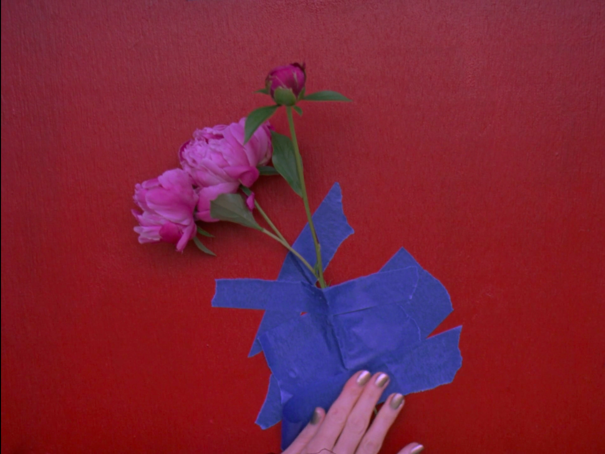 In the synopsis for the video, Barber states that “the reverence for beauty ends up pointing towards the abstract expressionism and color field painting of high modernism that, in many cases, eschewed the banality of such ‘natural’ beauty” like cut flowers. Taping over the peonies, Barber obscures their beauty. She is aware of what we want, but “3 Peonies” doesn’t indulge our attraction to fair, pretty sights and sounds. By hiding the flowers, she is not only teasing us by hiding their beauty but protecting us from their beauty as well. Their absence does not hurt us if we aren’t aware of their presence. Out of sight, out of mind, as they say.