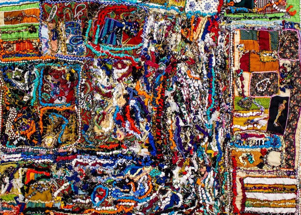 Eric N. Mack (b. 1987, Columbia, MD) refers to himself as a painter, yet his works rarely observe the medium’s traditional canvas-to-stretcher format. Rather, his tactile assemblages, created from a dynamic combination of used textiles, worn clothes, moving blankets and torn rags, alongside photographs and pull-outs from books and magazines, extend and transform the notion of painting. His use of color, form, and material as elements in a compositional lexicon, as well as the stained or dyed fabrics which are his principal medium, declare the origin of his practice in the investigation of painting in an expanded field, while the way his compositions occupy and transform space are evidence of their sculptural nature. They are both paintings and sculptures—fully engaging with both disciplines.