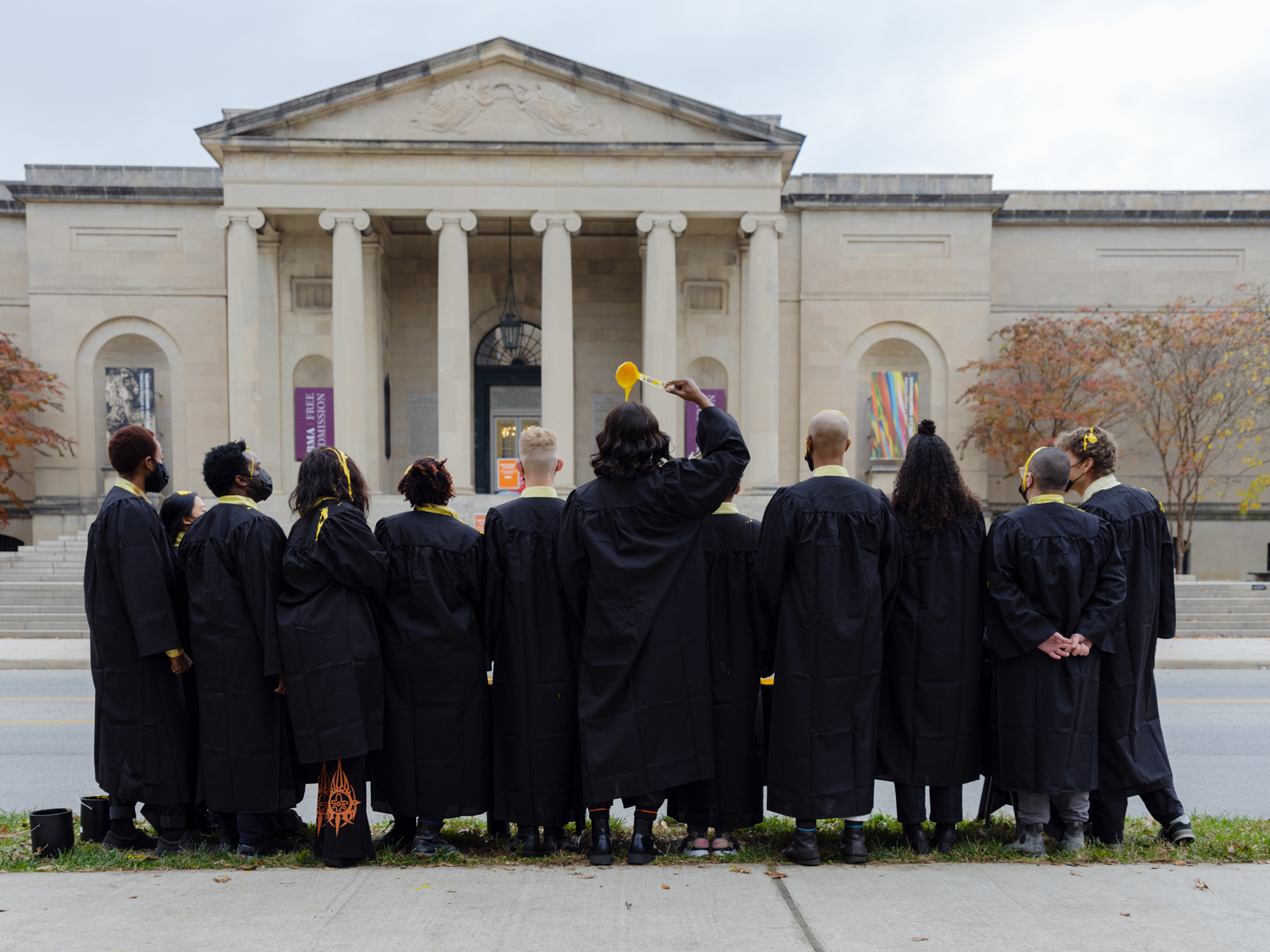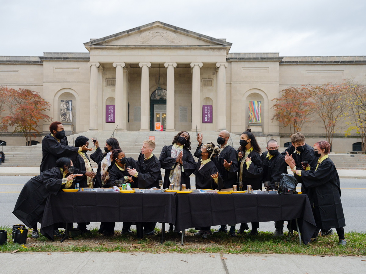“Dealing with performance art in a pandemic is nerve-racking,” admits Monsieur Zohore, a few days after organizing a guerrilla performance outside the Baltimore Museum of Art. On Sunday, November 28 at 4 p.m., Zohore, with twelve other artists in black robes, ate pizza and drank wine served on a long rectangular table while being dribbled in bright yellow paint. The performance was intended as a reenactment of Andy Warhol’s “The Last Supper” (1986), a giant yellow recreation of Leonardo Da Vinci’s famous fresco from 1498. The Warhol, a 35-foot-long double screen print of the Da Vinci on canvas, was listed for private sale by the museum for $40 million in early October but pulled off the market on October 28, the date of the intended sale.