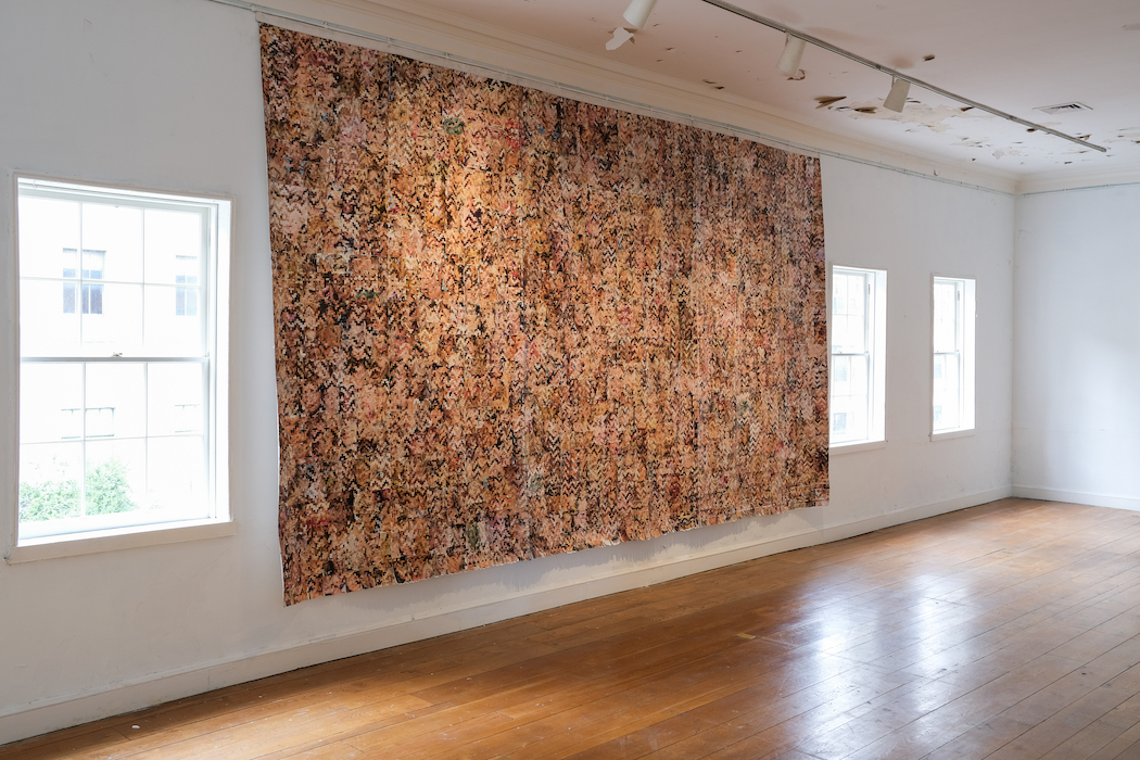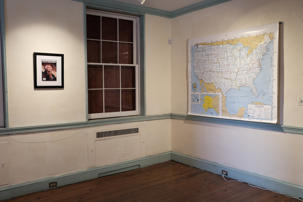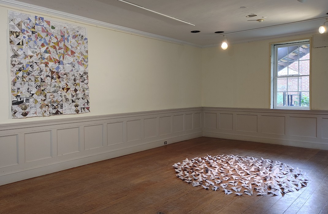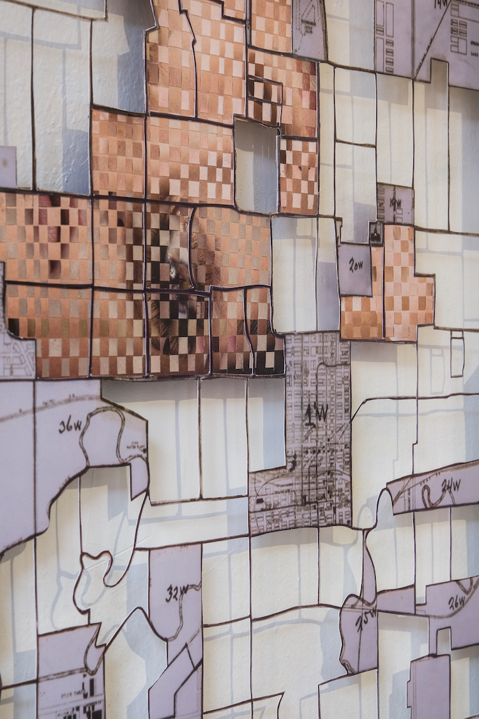Again and again, confronting these maps, weavings, and tapestries, I’m struck by the labor required by each one. The enormous “White Side,” an extension of the artist’s “Whiteness and Media” series, measures 11 x 19 1/2 feet (or a few inches narrower than Picasso’s Guernica). It utilizes magazine pages backed by Tyvek and hand-woven into an overwhelming field of glitching white faces overlapping and backing one another. Here, the Tyvek creates structural support, but the very nature of hand-weaving all of these white faces together, too—over, under, over, under—reinforces the relationships of power and kinship. Because of the privileges that whiteness bestows within a white supremacist state, white people easily remain invested in it rather than in ceding that position.