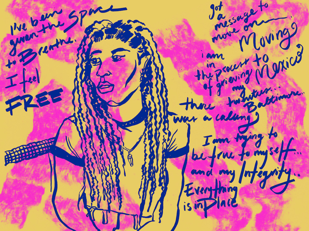 Precious Blake is a visual journalist. In her drawings, which focus primarily on members of the Black artistic community of Baltimore, Blake uses illustration as a means to build an archive of voices that are often unheard elsewhere. Her drawings blend layers of vibrant markers with handwritten text, alternating between her own hand and her narrator’s language. It’s important for her to meet her subjects where they are most comfortable, visiting them at home and in cafés (when it’s not COVID times) because, as Blake explains, “I’m as much an environmental artist as a portrait artist because I believe that the things that we hold on to and the places we frequent tell just as much about who we are.”
