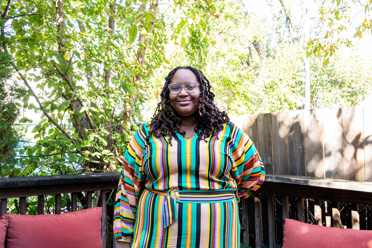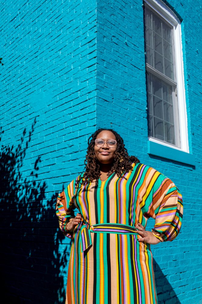 WEARING: Yellow, green, and orange multi-striped dress, sandals, pink eyeglasses, yellow wooden earrings