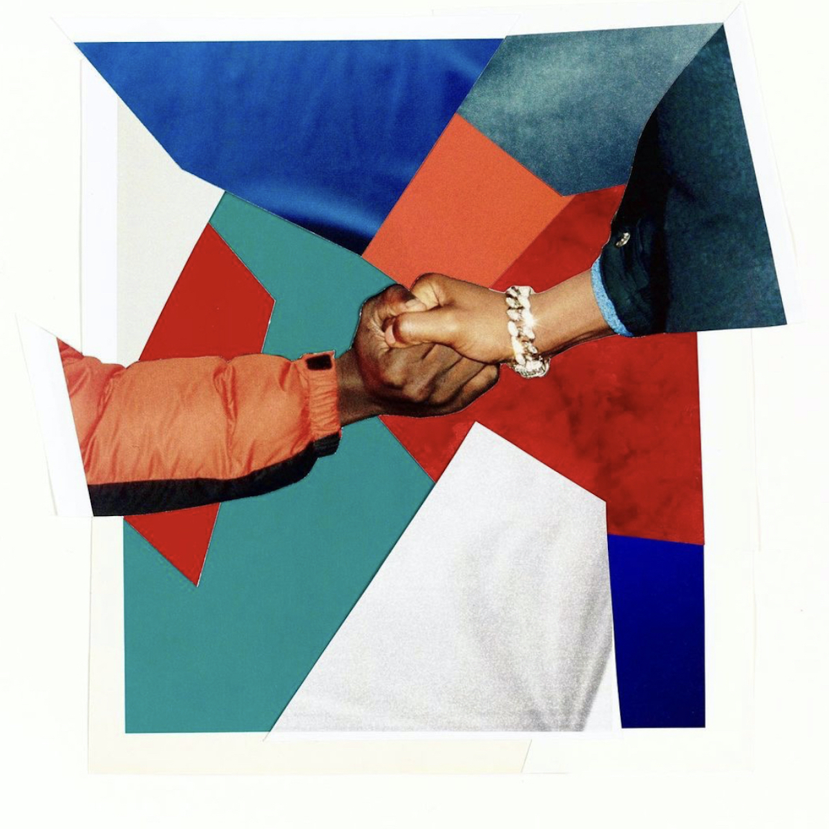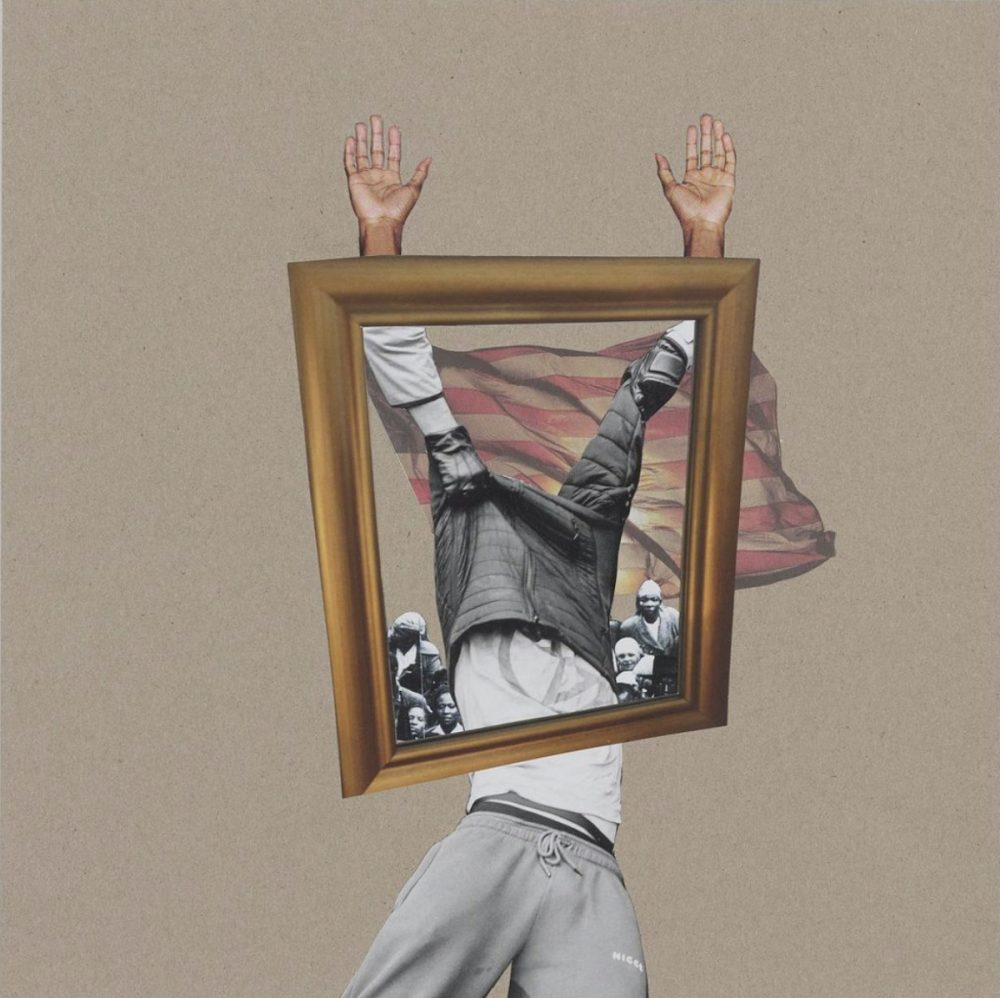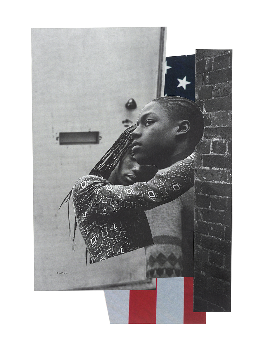 In “What Do You Have To Lose?” two young people embrace, one subject’s braided head resting gently upon her companion’s shoulder. The artist has superimposed them atop a fragment of an American flag, one figure’s back against a brick wall. Their bodies imbue the symbol of colonization and white supremacy with a tenderness that it does not deserve.