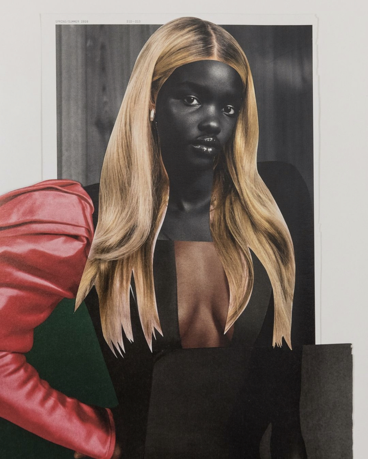 In other moments throughout the show, Sterling-Wilson explores hair. “I think, in the Black community, hair is a very big element for us,” she says. “There’s a lot of beauty standards that I think are societal standards that we think we’re supposed to go by. That goes hand in hand with stereotypes.” I felt a sort of grim affinity with the title “Pretty For a Black Girl,” because I heard those words echoed to me during my childhood. The collaged pieces compose the subject, a Black woman with dark skin and a blonde wig, her left sleeve hot pink, her legs in fishnets, her cleavage on display, while her right arm tugs down on her dress, bright nails like claws. Her expression seems solemn and seeking. Does she want validation? Or compassion? Or does she stand alternatively defying and bucking the white eurocentric beauty standards that are unfairly promoted through visual culture and advertising?
