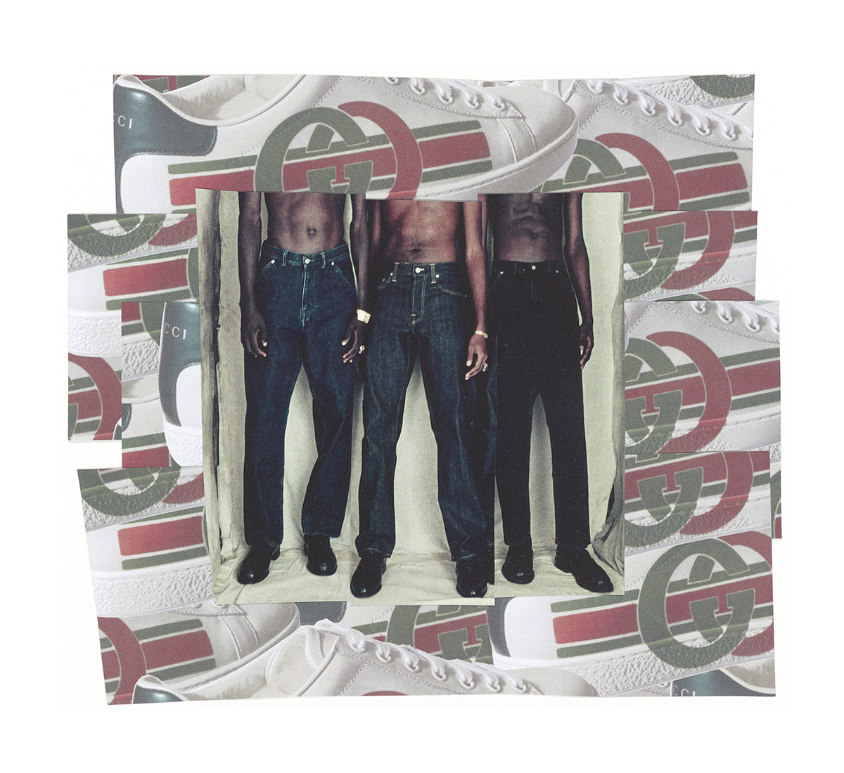 The titles from the pieces carry heavy and familiar meanings that trigger emotional responses when read aloud: “Hands Up Don’t Shoot,” “T.H.U.G.,” “Pretty For a Black Girl.” “Line Up” was the most startling and compelling one for me. The piece depicts three Black male figures—but here they are torsos, with their heads not visible, their chests bare, all three of them wearing dark, starched blue jeans. Framed by a wallpaper of Gucci shoes, the title “Line Up” can either echo mundanity and refer to them getting their haircut in the refuge and joy of a Black barbershop, or it can signal isolation and death, perhaps referring to the three men being forced to participate in a prison line-up photo. The viewer does not know. And this dual possibility is a painful truth for Black men in this country.
