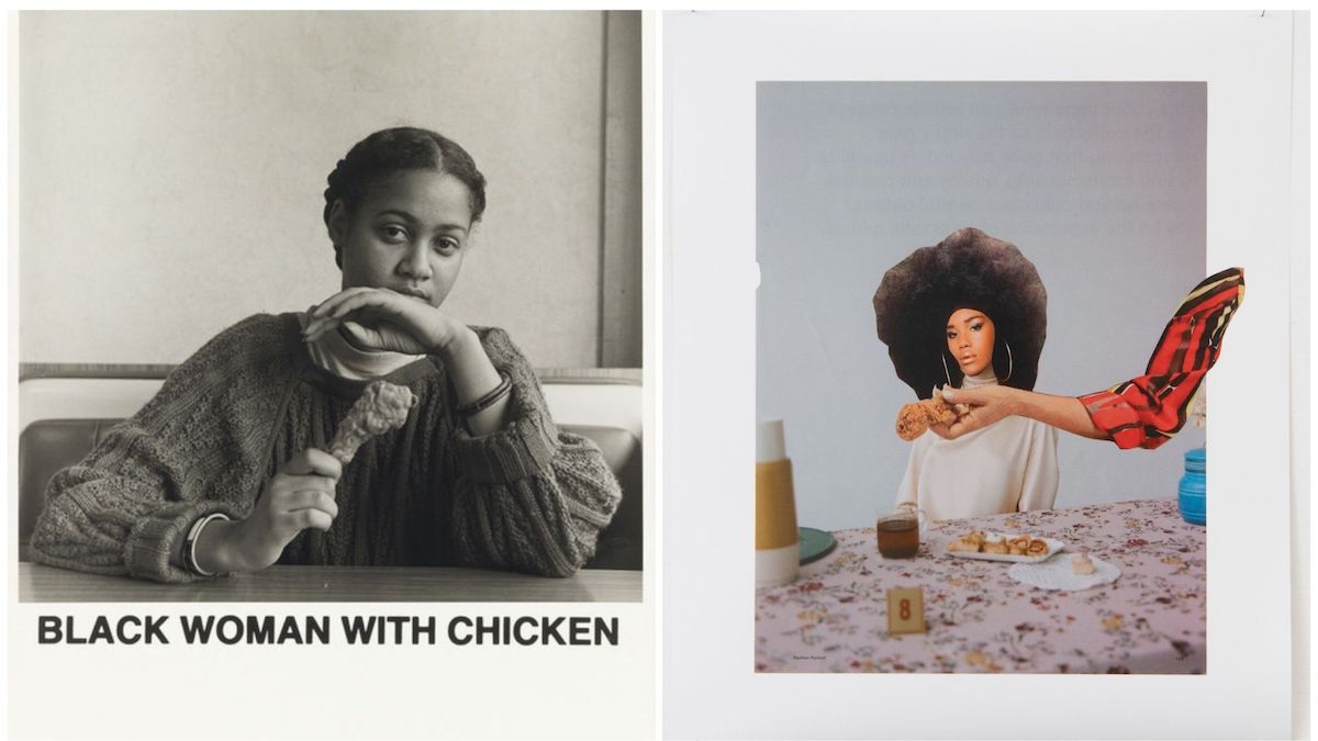L: Carrie Mae Weems, Black Woman With Chicken, 1987 and R: Bria Sterling-Wilson, Black Woman Eating Chicken, 2020