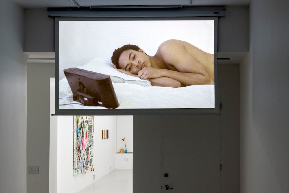 Conceptually and formally, the works pivot on perspective, duplicity, and the body as surface. The objects all change depending on the viewer’s position and presence, and all of the objects engage viewers in one obvious sense but then perform something different. Meanwhile, the artists’ manipulations of material surfaces sidestep stereotypical imaginings of the Black male body. In a gigabyte video comprised of one long shot, Williams lies in his bed naked—a revised take on the art historical tradition of the reclining nude. His miniscule, mundane movements suggest repose as well as stagnancy. Zohore’s paper towel “paintings,” on the other hand, transform the surface—the body—of the work. Canvas substrates covered in layers of paper towels imprinted with images culled from popular culture approximate paintings but they are in fact sculptures. Zohore’s half-real, half-fake birds of paradise rooted in Windex function similarly. Rather than a vibrant flowering plant in fertile soil, his birds of paradise start to bloom then die before realizing their full potential.