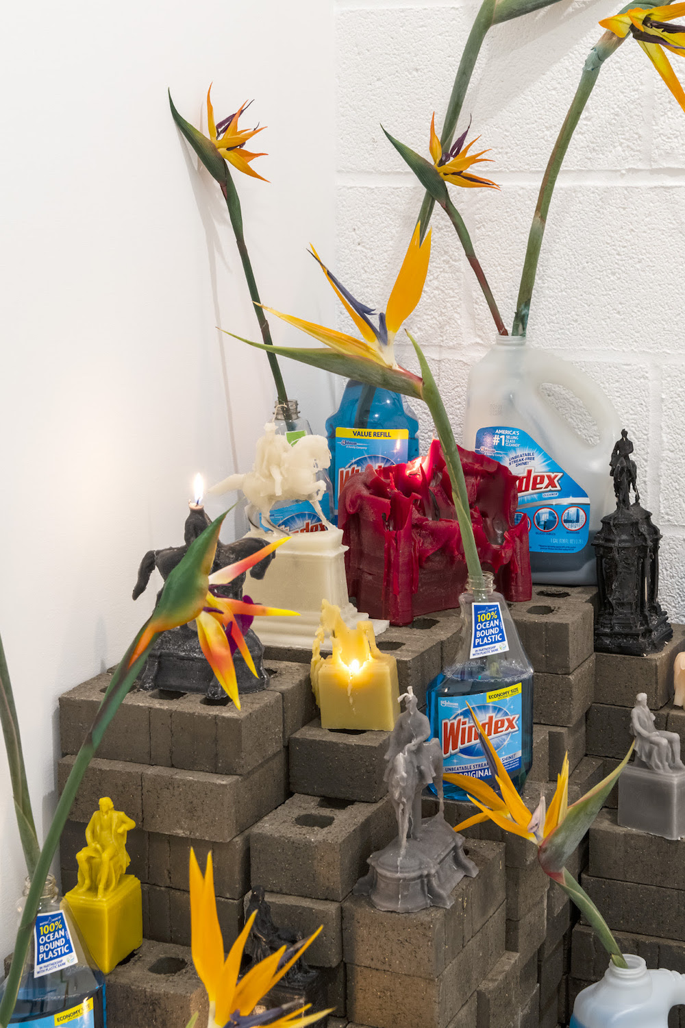 Thematically, contemporary culture and current events such as living through a pandemic and a new era of racial reckoning infuse the works in Ozone Atmosphere with a fleeting urgency that finds kindred expression in immateriality and impermanence. Zohore’s dragon balls live in Plexiglas boxes amid grass that will wither and die during the course of the exhibition. A reference to the Japanese animated series of the same name where the characters journey to resurrect lost loved ones, each set of Zohore’s dragon balls memorializes either one of the artist’s kin or a significant historical figure. Nearby, Williams’s wax candle sculptures and family portraits, both of which mimic the form of equestrian monuments, slowly melt and fade as his alluringly transparent backpacks mark time and memory. Within these works, bleach, fabric dye, resin, and paper towels comingle with wax and time-based media just as fact mixes with fiction in an increasingly uncertain world.