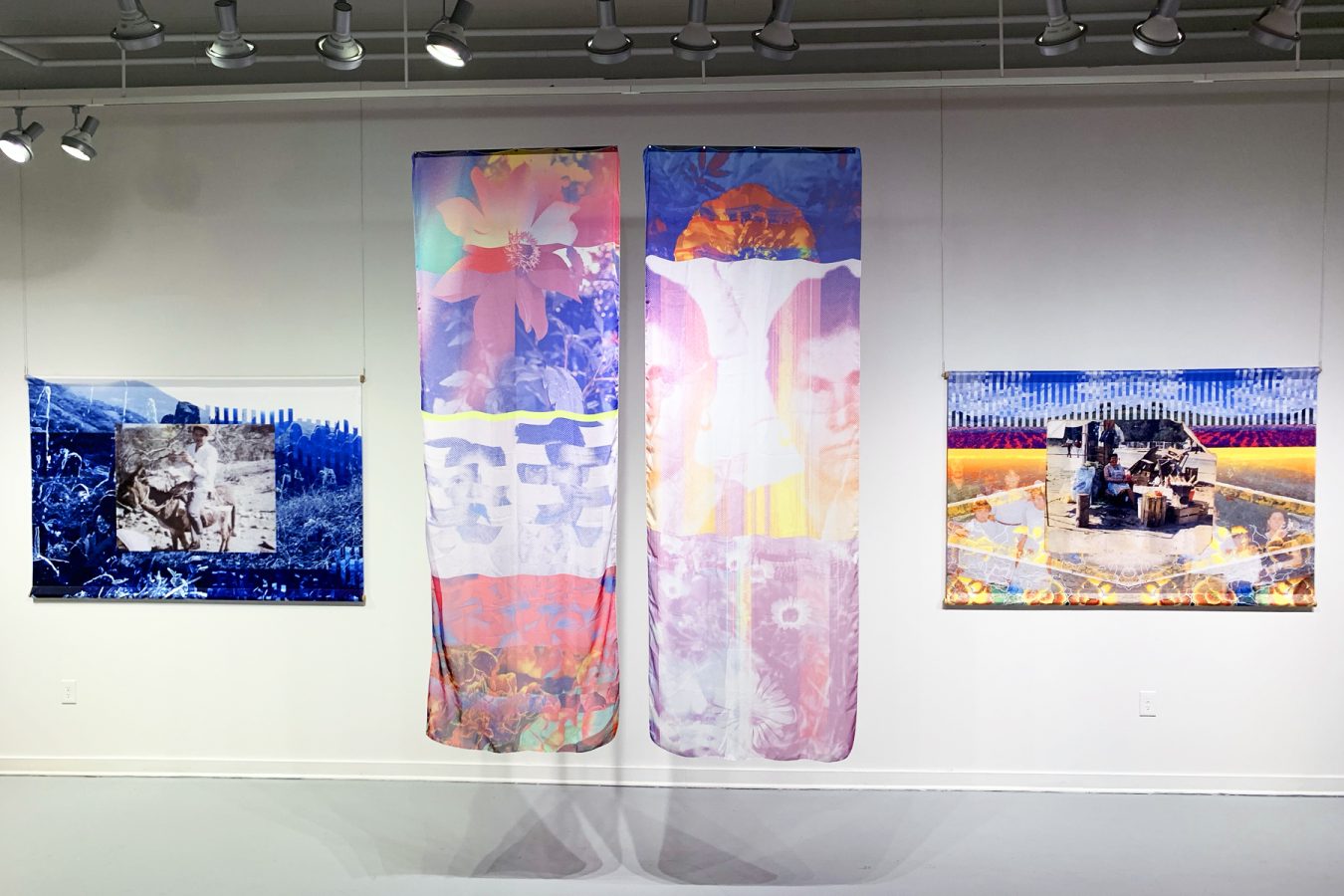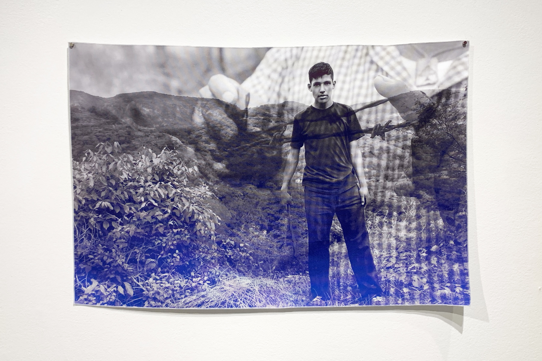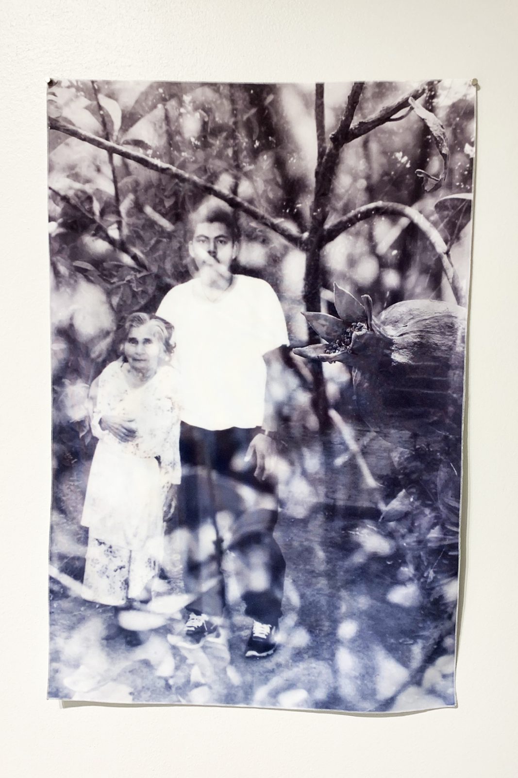 That Polaroid photo appears in a piece in Reyes’ current solo show, Fragments at VisArts in Rockville; it’s reproduced within a large collage printed on billowy chiffon. In the photo, young Reyes looks overjoyed, mouth agape, sitting close to his smiling mother. On the wall behind them, a small icon of Jesus Christ keeps watch, nestled into the photo’s upper right corner. The white border bears a handwritten caption: “Con mucho cariño para mi Abuelita” (with much love for my Grandma). The clarity of this photo anchors the rest of the piece, which is awash in dreamy, technicolor clouds and modular plants that glitch and cut out just like memory does. Installed in the gallery, the piece itself never stays stagnant, just like memory doesn’t; the room’s airflow makes the delicate chiffon undulate.