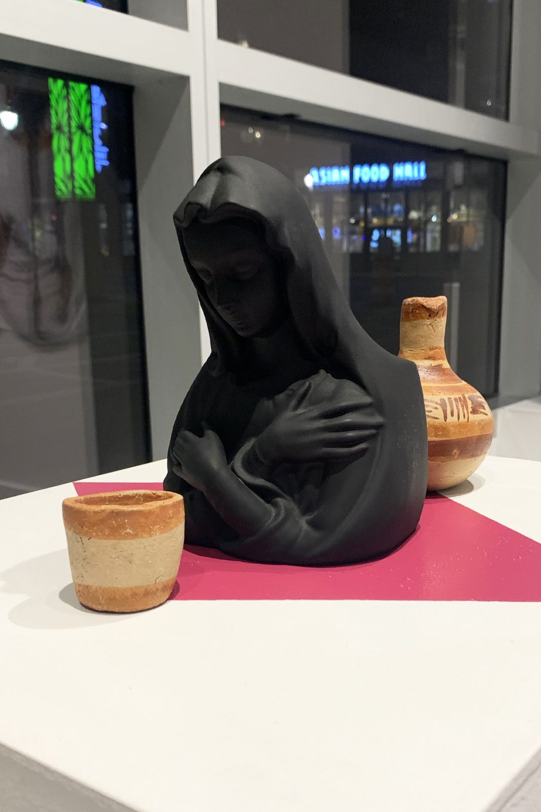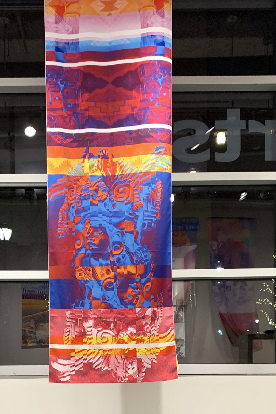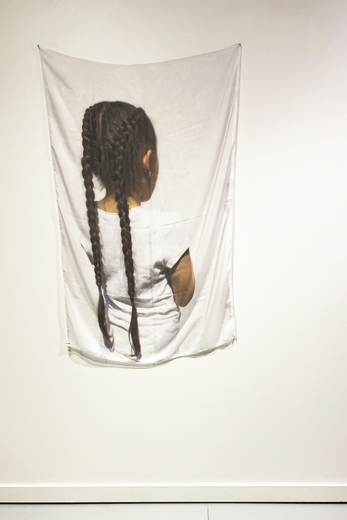 That Polaroid photo appears in a piece in Reyes’ current solo show, Fragments at VisArts in Rockville; it’s reproduced within a large collage printed on billowy chiffon. In the photo, young Reyes looks overjoyed, mouth agape, sitting close to his smiling mother. On the wall behind them, a small icon of Jesus Christ keeps watch, nestled into the photo’s upper right corner. The white border bears a handwritten caption: “Con mucho cariño para mi Abuelita” (with much love for my Grandma). The clarity of this photo anchors the rest of the piece, which is awash in dreamy, technicolor clouds and modular plants that glitch and cut out just like memory does. Installed in the gallery, the piece itself never stays stagnant, just like memory doesn’t; the room’s airflow makes the delicate chiffon undulate.