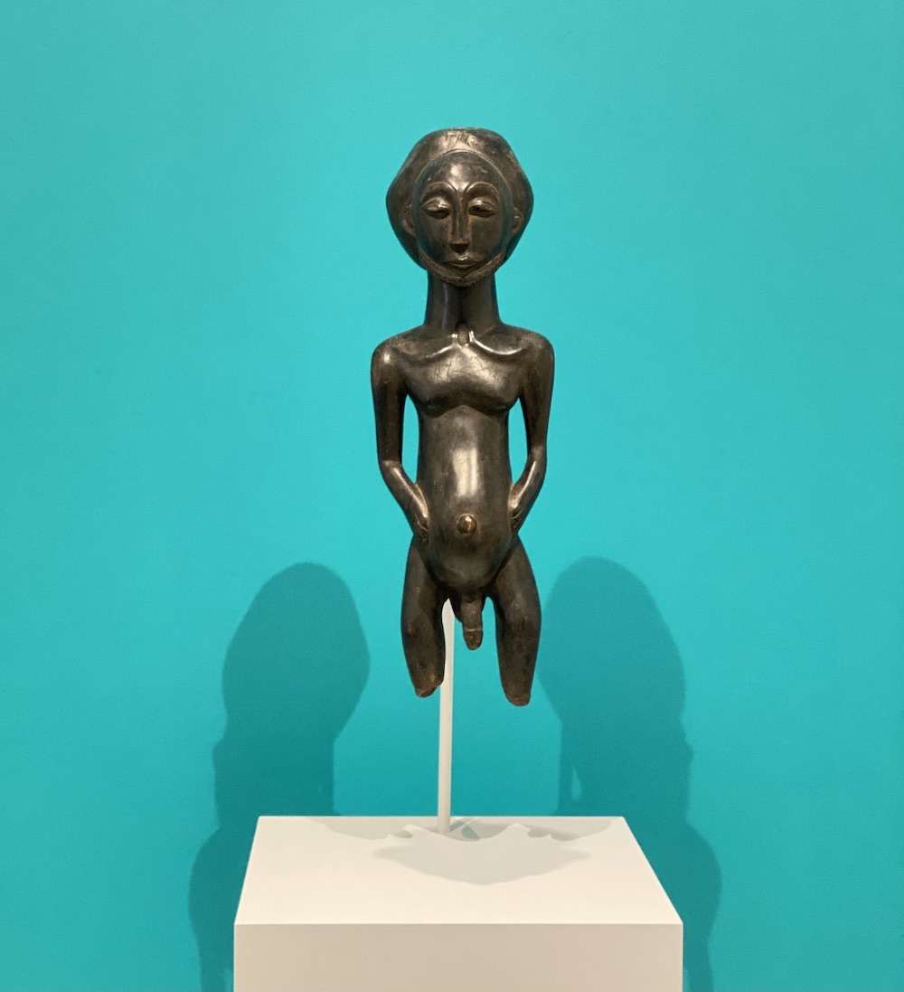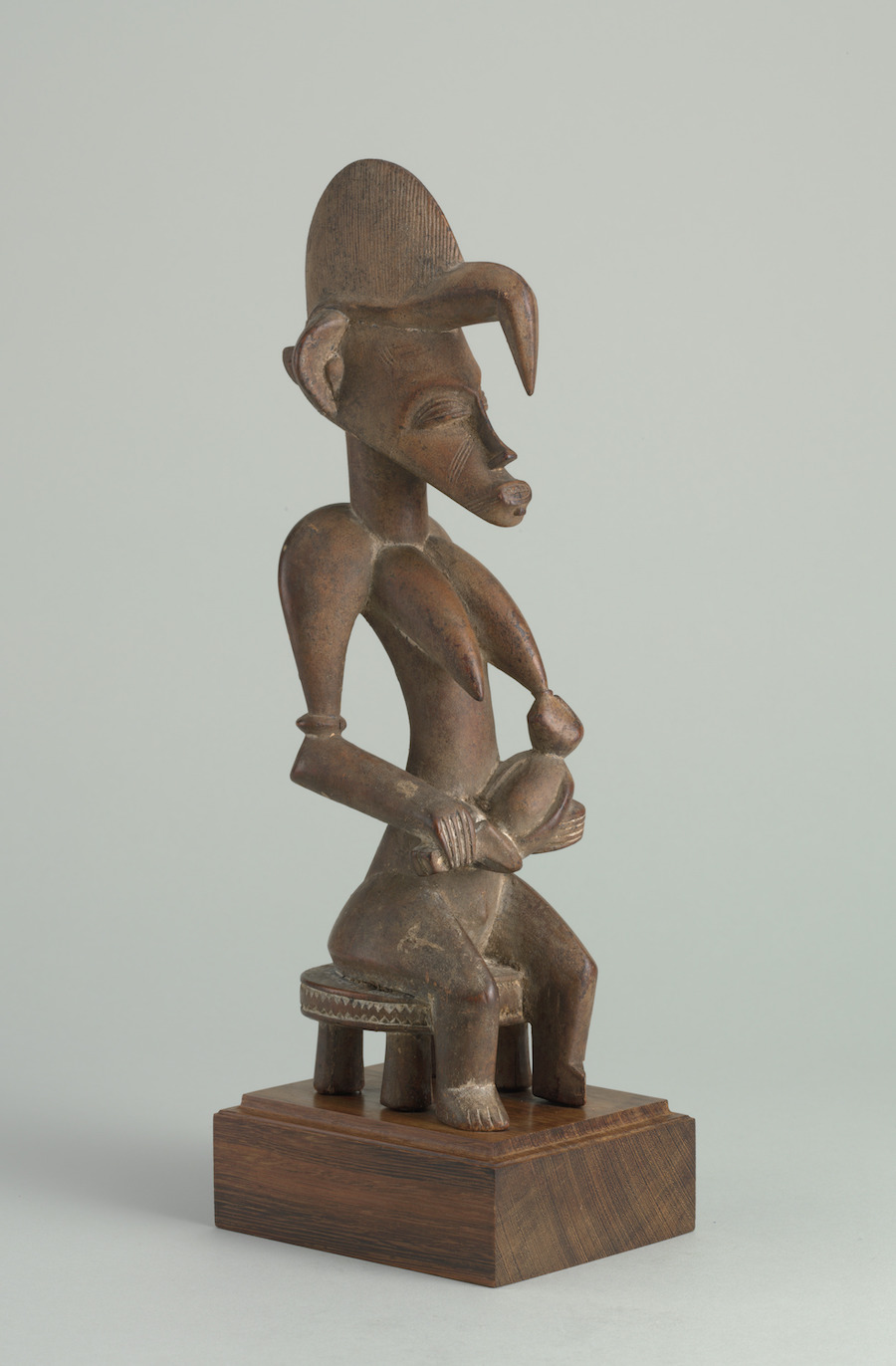 The original artists who created the nearly 40 pieces on display are not as well-known as their Western custodians. One-third of the objects came from the BMA’s permanent collection, another third came from private collections, and the rest came from other institutions, such as the University of Pennsylvania Museum of Archaeology and Anthropology. Most of the African societies represented were located in Zambia, Angola, the Democratic Republic of Congo (DRC), and Guinea. Collectively, the objects in the show celebrate the role and responsibilities of “mother,” both within and in defiance of a Westernized context.
