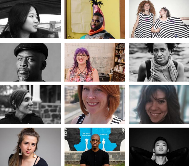 Featured image: Twelve of the 2021 Baker Artist Awardees—from left to right, starting at top: Cheng Wei Huang, Abdu Ali, Outcalls Band, Larry Poncho Brown, Rahne Alexander, Pamela Woolford, Dina Fiasconaro, Kathy Flann, Elizabeth Hazen, Colette Krogol, McKinley Wallace III, Allen Xing