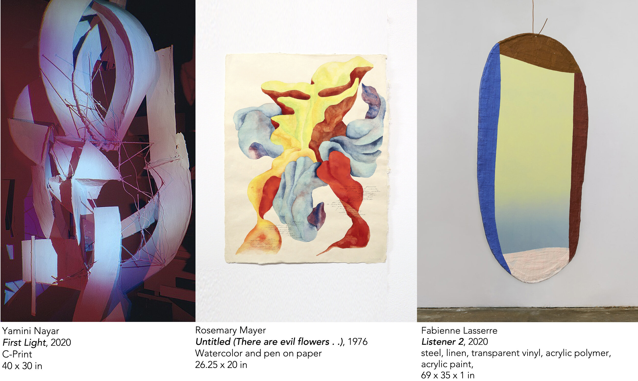 A three woman show featuring Fabienne Lasserre, Yamini Nayar, and Rosemary Mayer, curated by Max Warsh.
