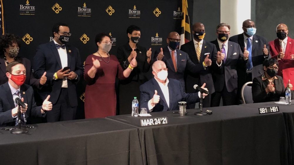 Sitting with the presiding officers of the General Assembly, Hogan signed the bill at Bowie State University on Wednesday afternoon.