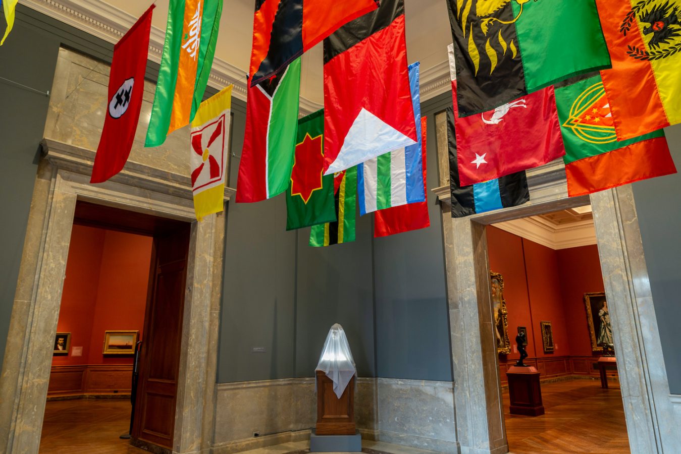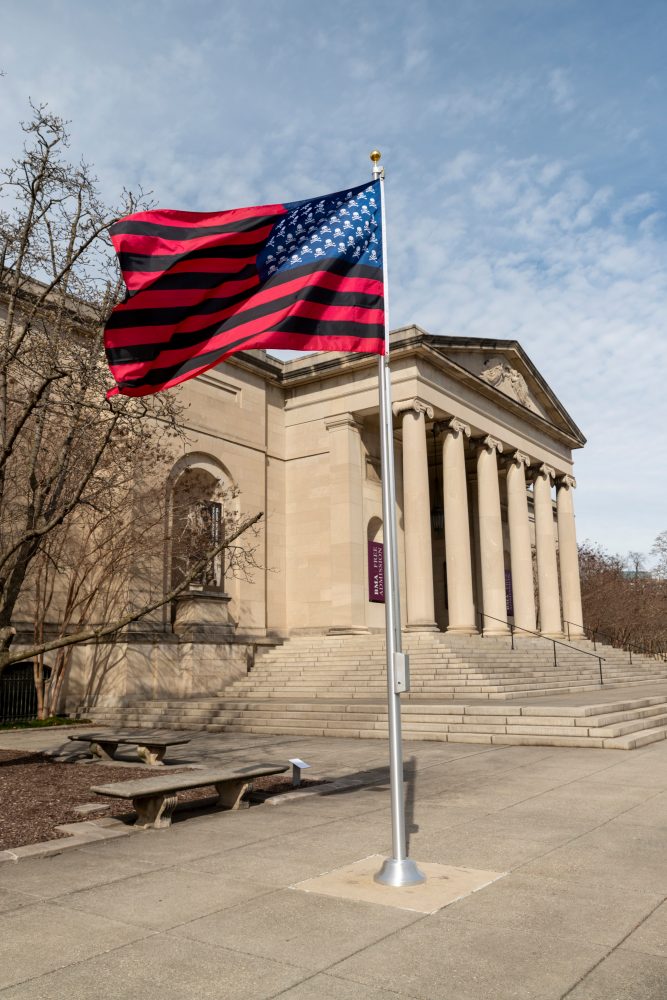 It seems, at least, to flutter proudly. Hung from a tall pole in front of the BMA, the flag is more than large enough (at 6 by 10 feet) to catch the eye of passing motorists, and on a breezy spring day, it comes to life, its familiar pattern of white spangles on a blue field and tidy stripes rippling lightly. Nothing remarkable here, perhaps: just one of so many American flags displayed before so many staid stone facades. But stop a moment and look closer. The white stripes, you’ll notice, have been replaced with black ones, and the stars with skulls and crossbones. The stock icon has yielded to something darker and more ominous.