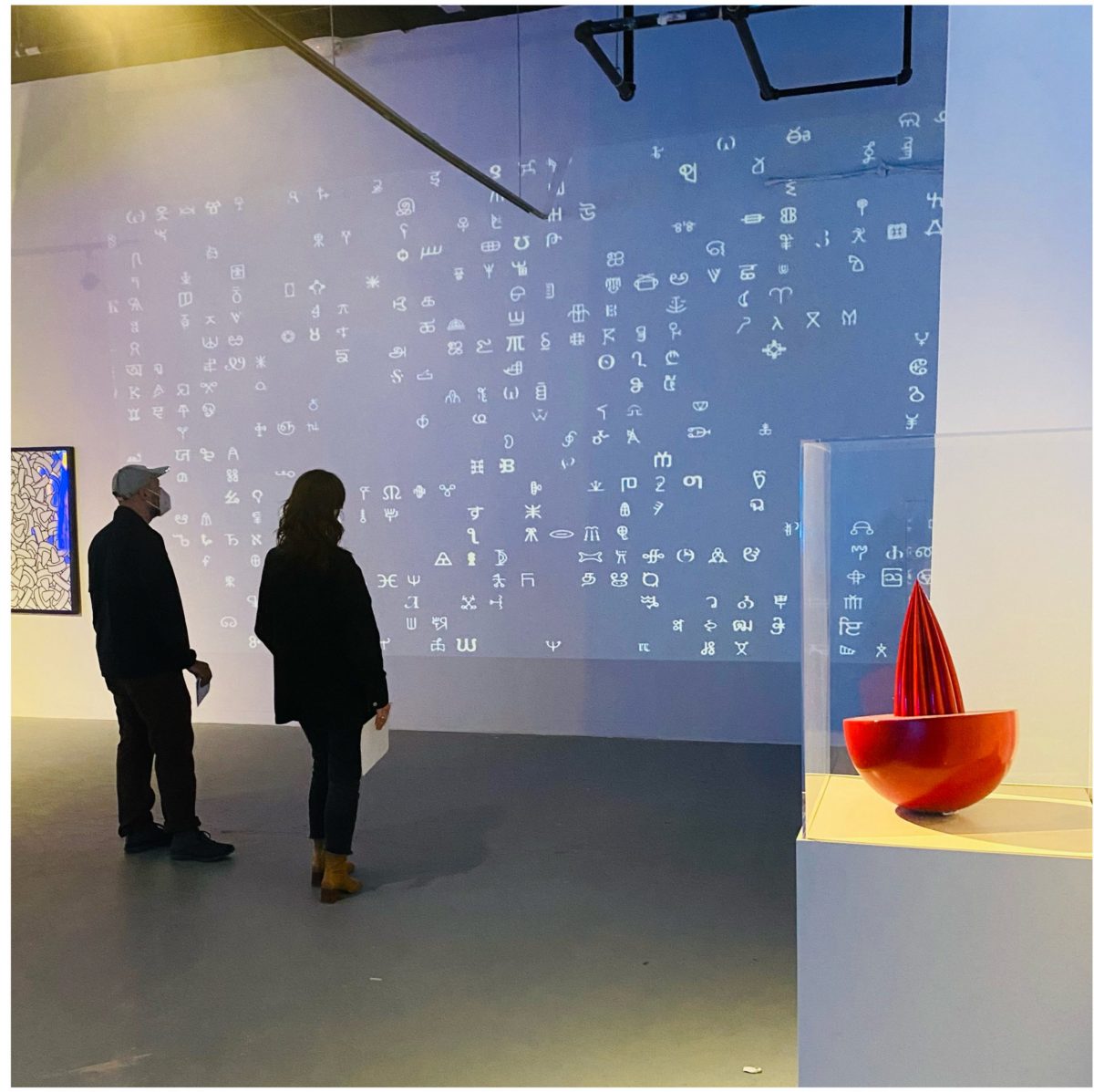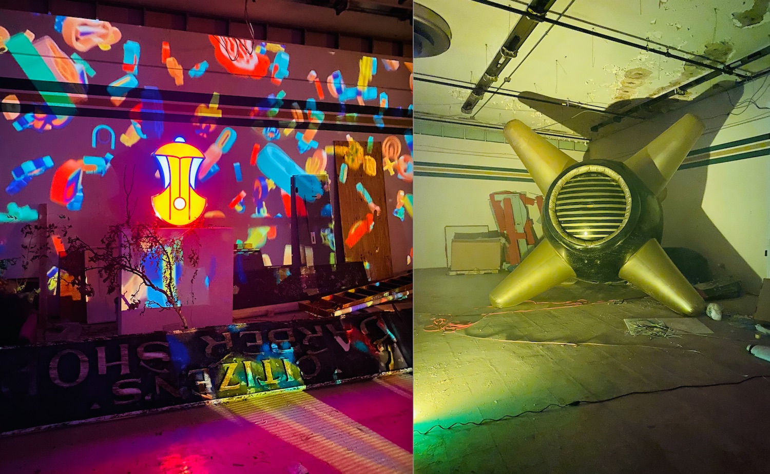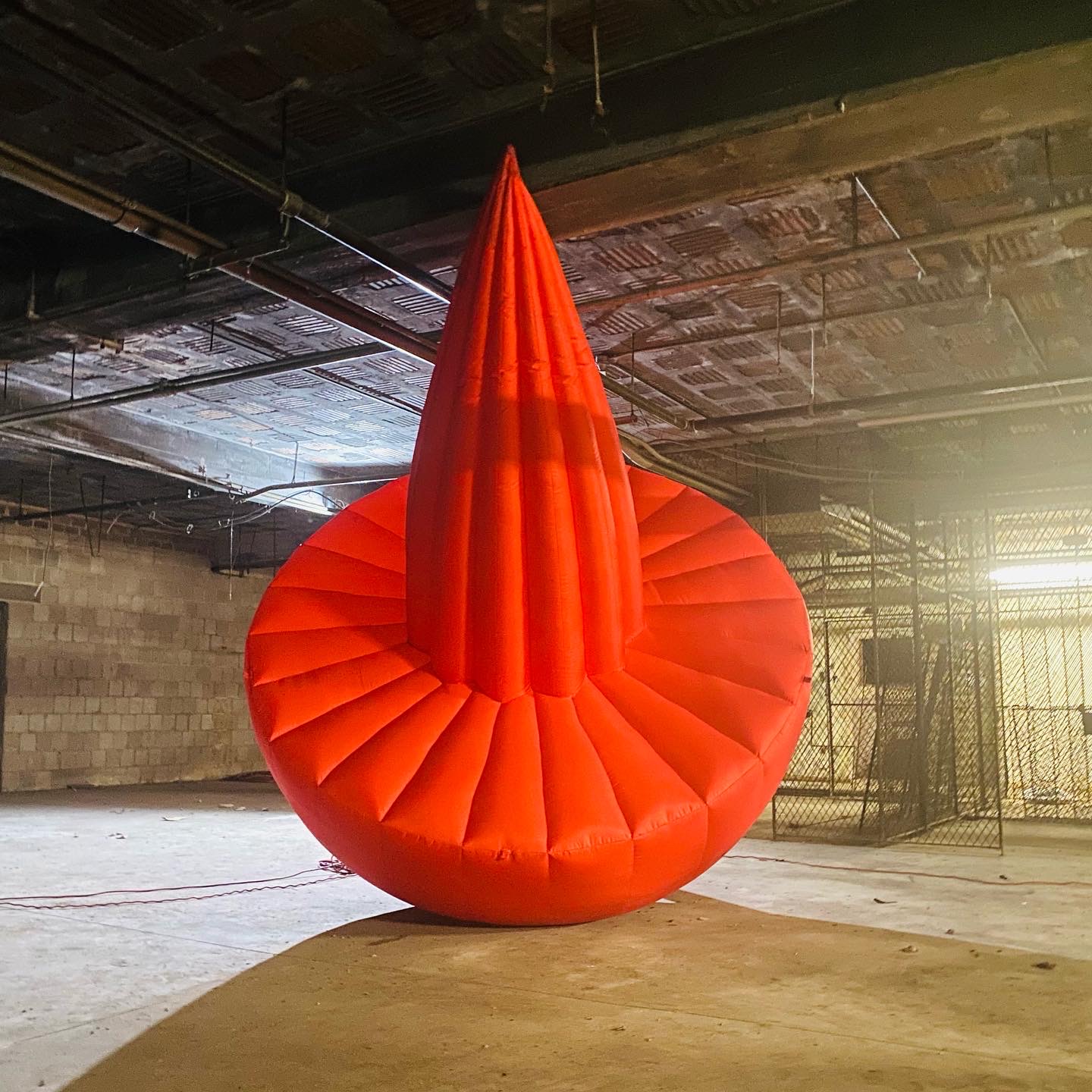 In relation to the criteria of scale, material, and iteration, a good example would be the artwork I call “Artillero” (or as artist Sasha Fishman called it, “a sophisticated red lemon squeezer”). This sculptural object, created in collaboration with the amazing artist Pete Karis and Paradise Labs, is first introduced in a process involving two main components: a hand-polished styrofoam half-sphere and a subsequent 3D-printed grooved cone glazed in red automotive paint. This is later translated into a large-scale inflatable sculpture iteration of the small-scale model, constructed with 500D Nylon. This dramatic shift of scale is, of course, deliberate, and is intended to generate a disorienting effect in the viewer. In addition, the thoughtful placement of the small artwork in the gallery space, followed by the large-scale model in the basement, is created purposefully to contrast the narrative of the real world (Baltimore) to the secret dimension that lurks in the spaces beyond the gallery walls.