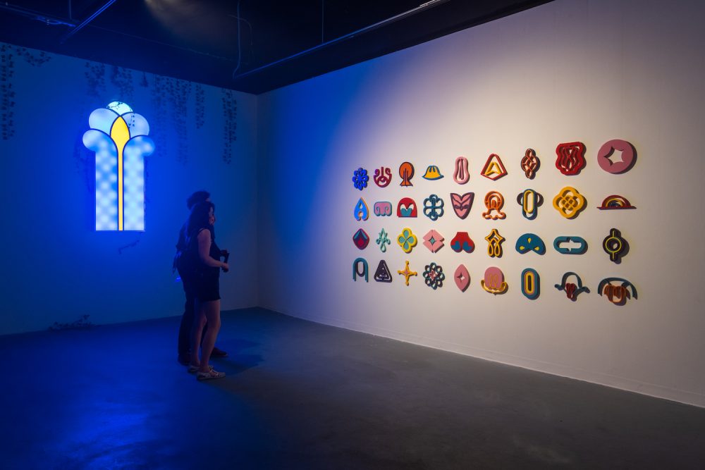 The materials involved in this exhibition include such a wide variety—it’s mind-boggling. Can you talk about your favorite materials, many of which appear fabricated, and how you use specific types of materials for an intended visual or emotional effect? (For example, giant inflatables vs. small ceramic versions of the same shapes, or the impact of neon and glowing laser-cut “signs” with interior light sources)?