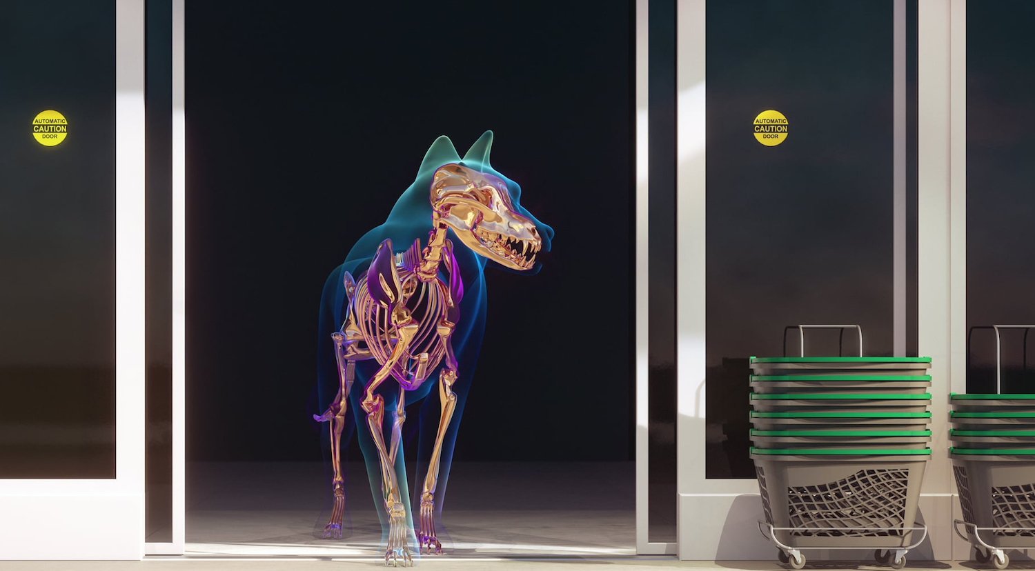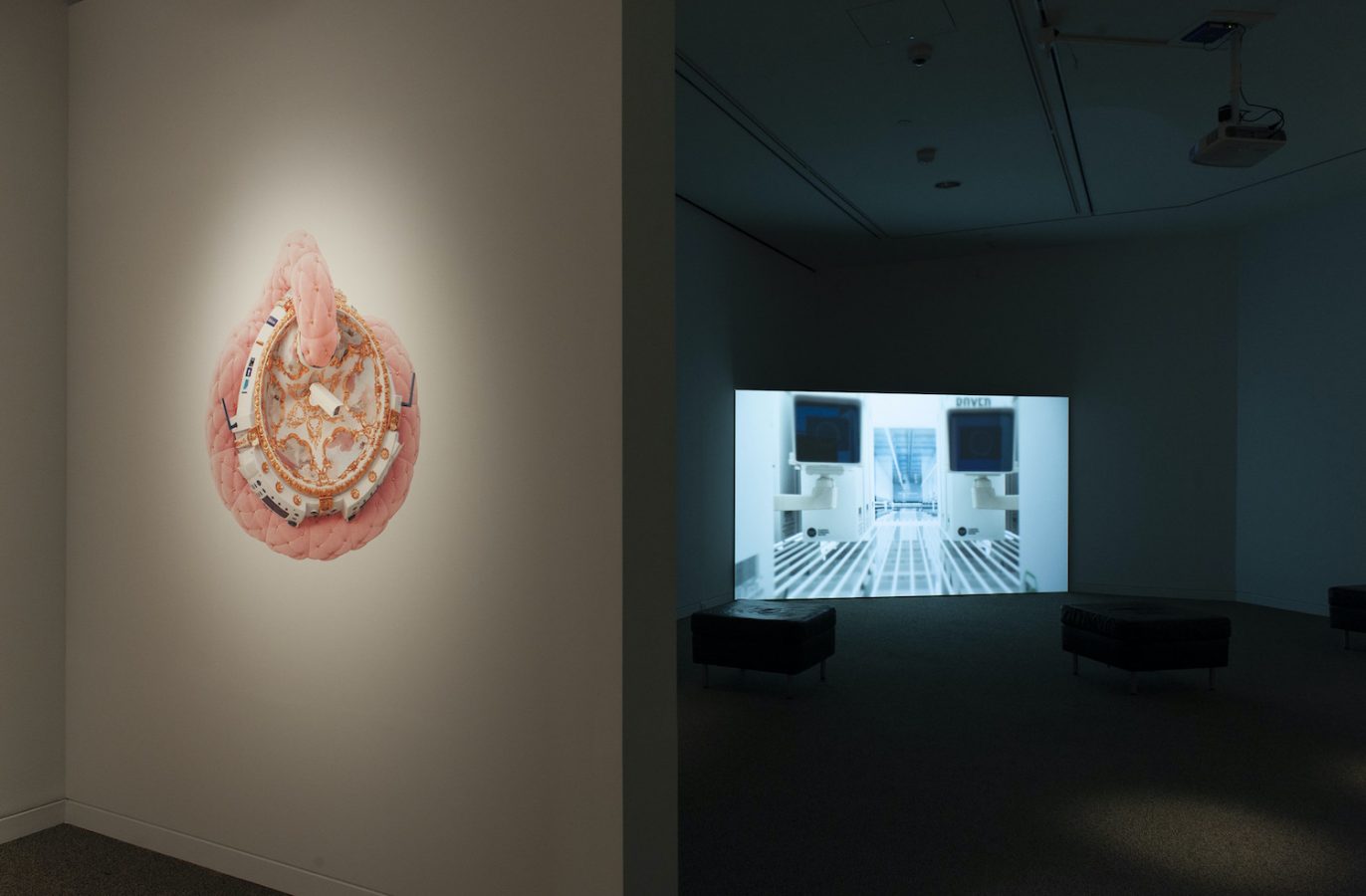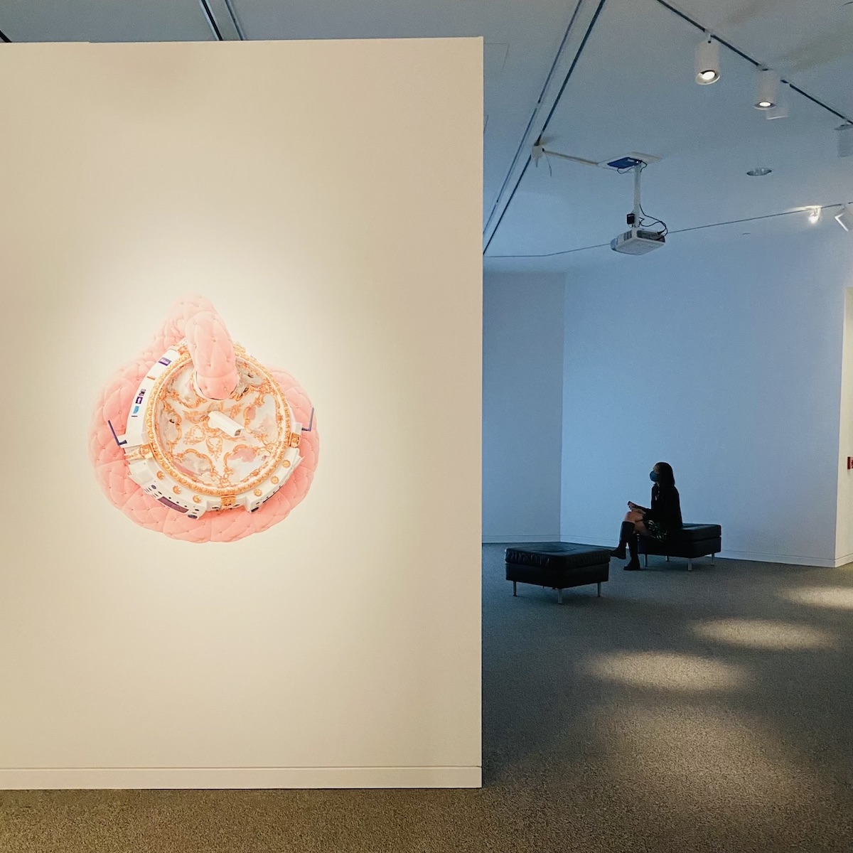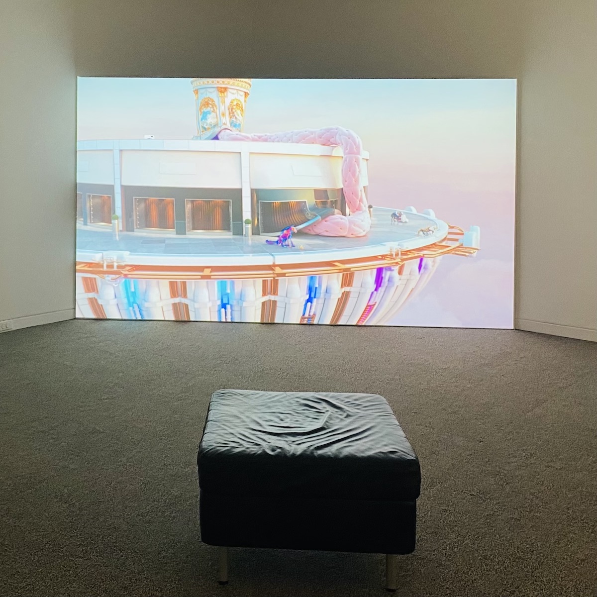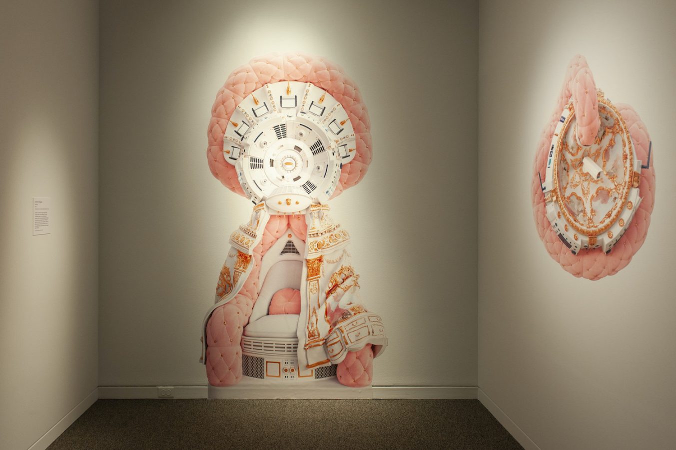 Monaghan’s Sondheim finalist exhibition space at the Walters Art Museum contains only two works, “Den of Wolves,” and a wall decal work, “Sentries IX,” which is from a series of works made using the same software as the animation. The “Sentries” series plays with texture and color, combining Baroque art and architecture with soft-looking pastel fabrics, a melding of the gaudiest moments in art history with contemporary technology.