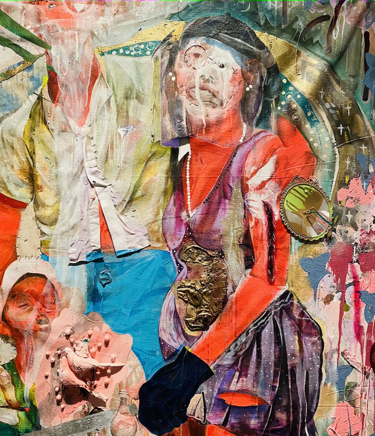 Detail from FAITH, HOPE & LOVE, 2021, acrylic, spray paint, mirror, beads, doll, faux birds, feather, plastic, and staples on canvas