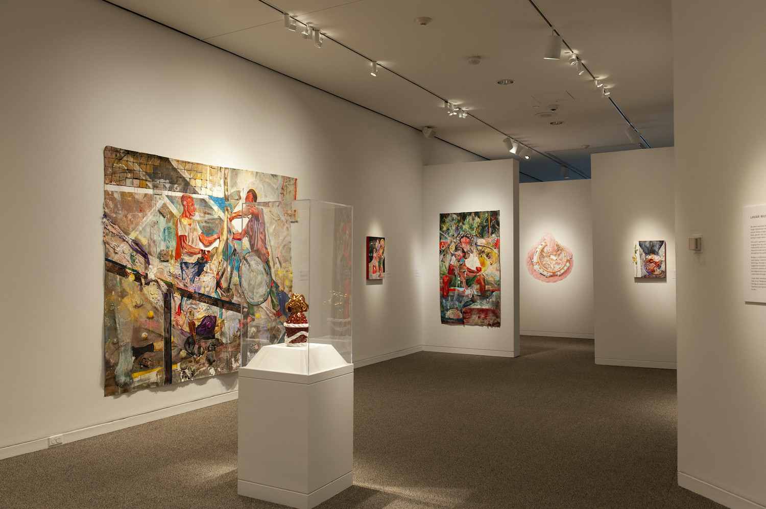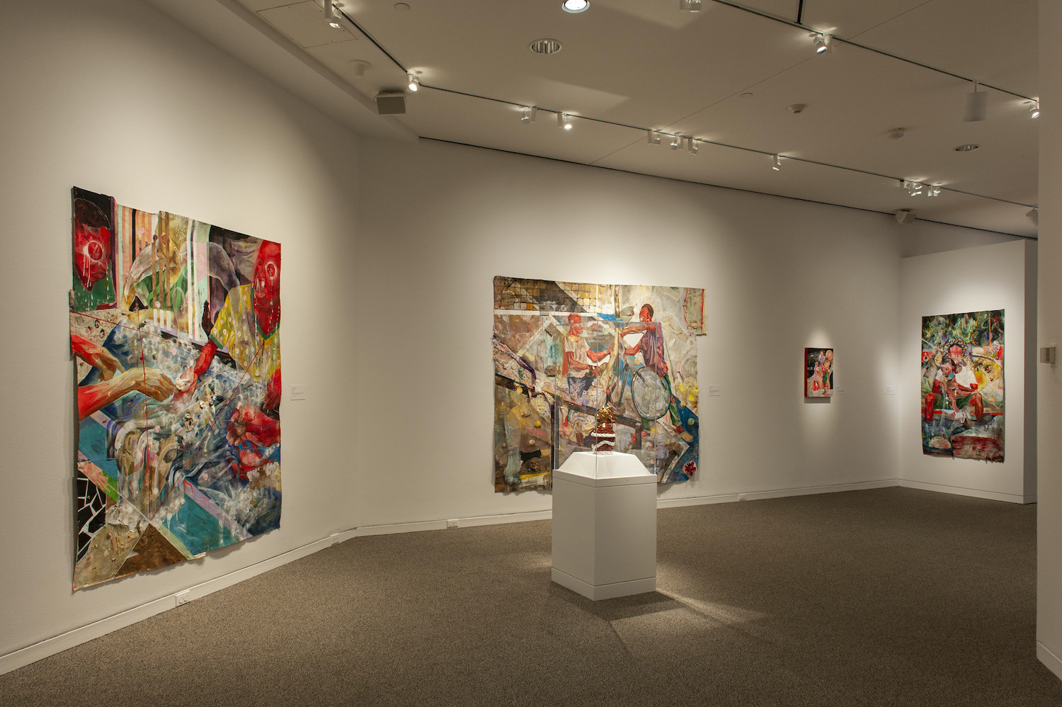 Death is so literal, so absolute, and yet so abstract and unbelievable. The question of what exactly happens after we die is unknowable but, as Munroe demonstrates, we can trace the ways someone else shaped our life and we can track the impact of their absence. The urn, created in 2016 and marked on the wall label as “ongoing,” is a profound way for the artist to include his father on this journey, and to honor his contributions to the abundant complexity and sacred beauty in the thick and accumulative paintings that surround them.
