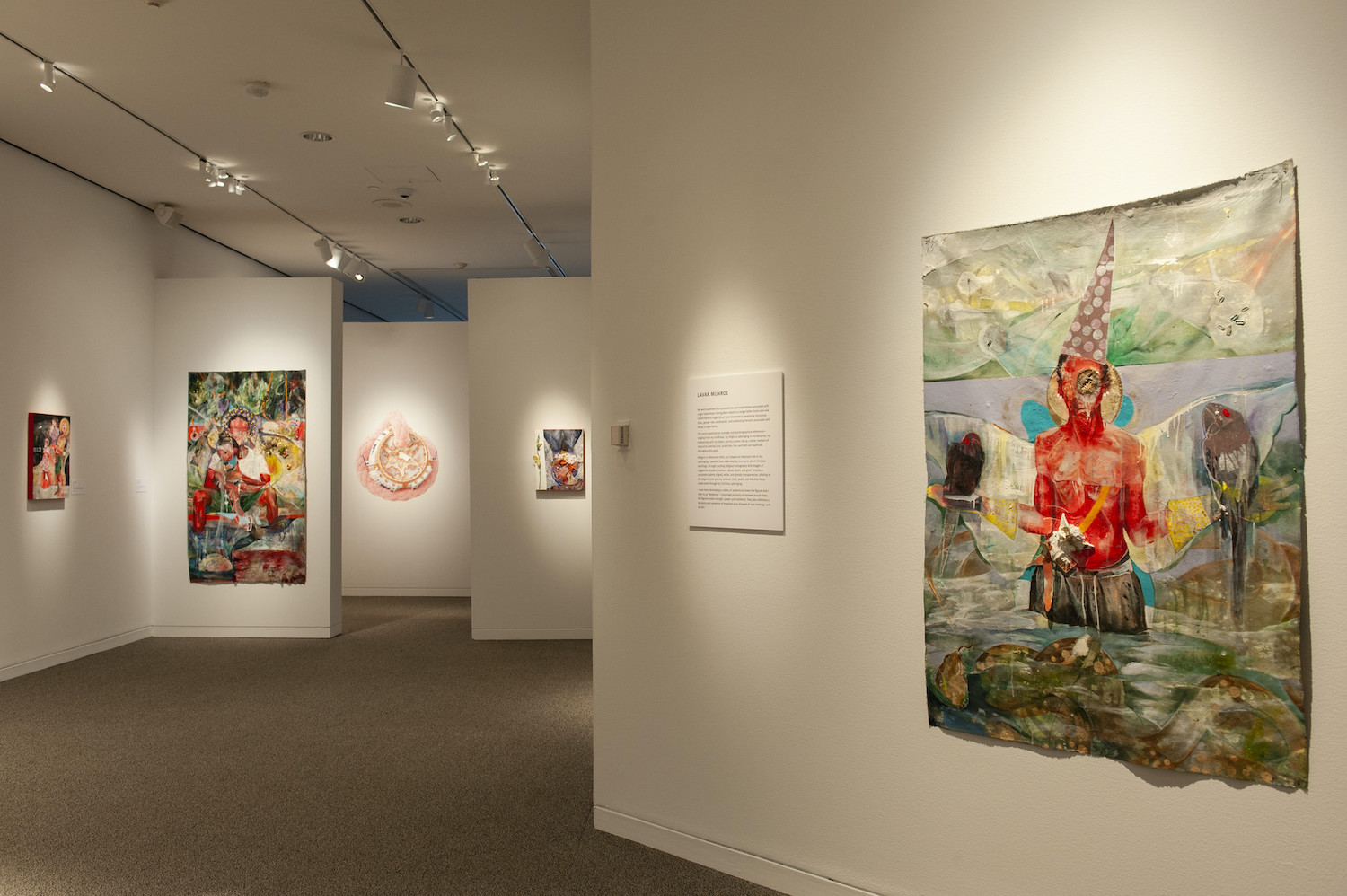 The most spiritually wrenching piece in this exhibit is also the only sculpture in Munroe’s exhibit: a glossy, red-and-gold urn the artist made out of clay displayed under a vitrine. Wall text reveals that it holds the cremated remains of his father, whose influence throughout this art is both emotionally and materially palpable. Surrounded by largely two-dimensional narrative paintings, I feel unsure how to regard this functional ceramic vessel that holds the earthly part of what this person left behind in death—a snap to reality amid an exhibit suffused with allegory and symbol.