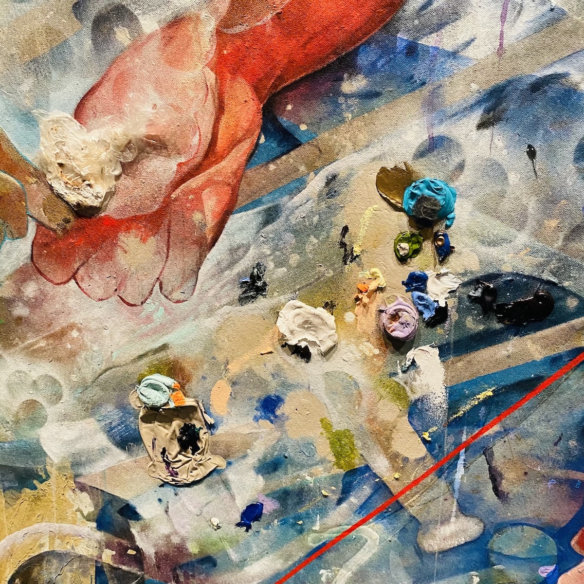 Tears leak from the eyes of the person on the other end of this exchange and from a stoic kid in the corner. Ghostly limbs surround them all and another set of disembodied hands joins them. Straight red lines divide the composition geometrically, but they also connect the figures. Lines point from one person’s chest to another out-of-view figure; another line comes from a small, almost hidden figure (who vaguely resembles some ancient colonizer/settler) to the foreground, directly involving you—me—the viewer as we speculate upon this whole scene.