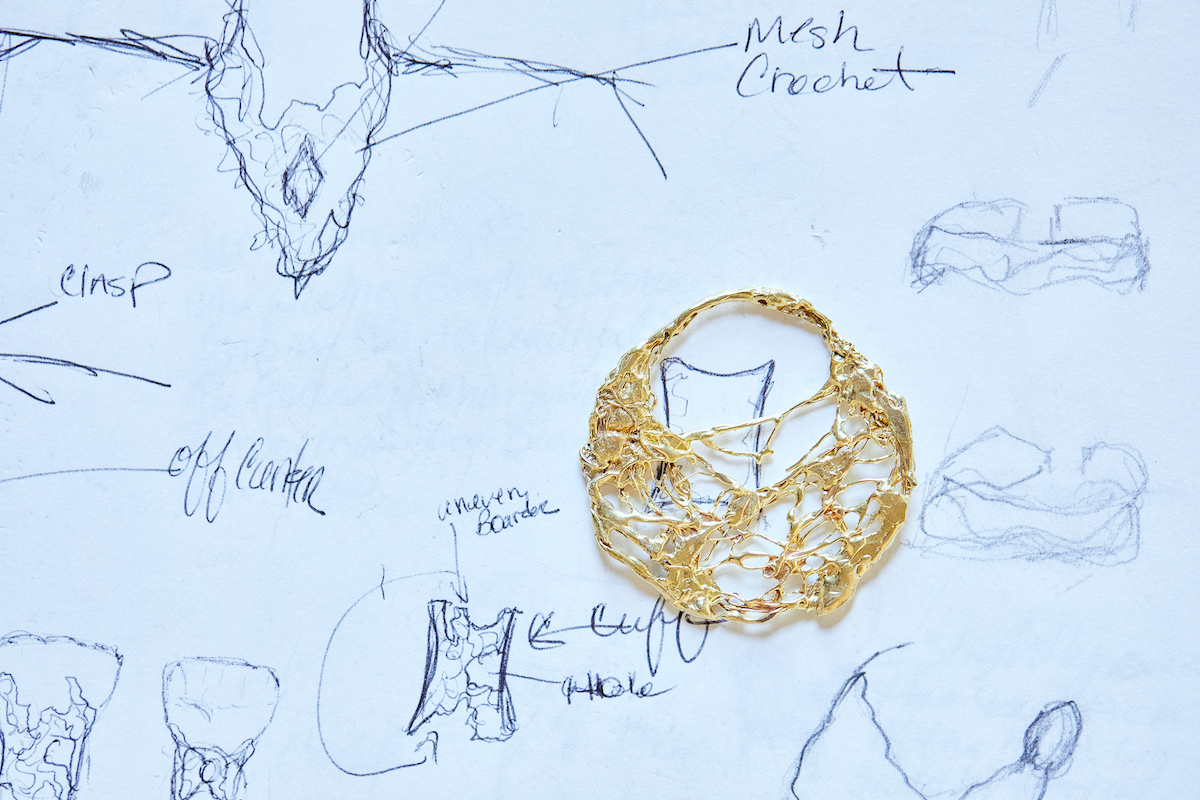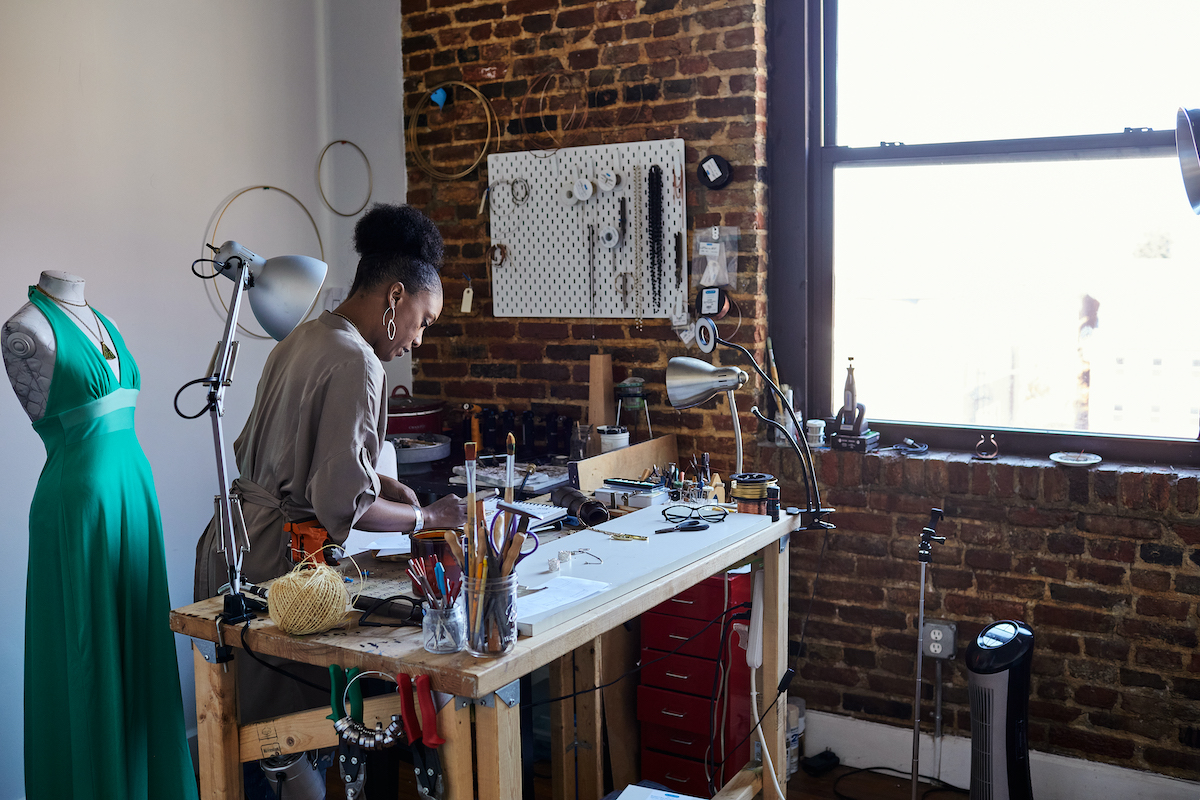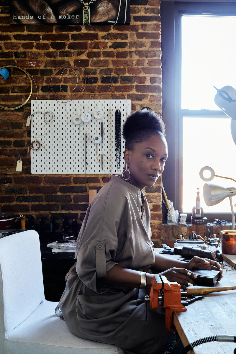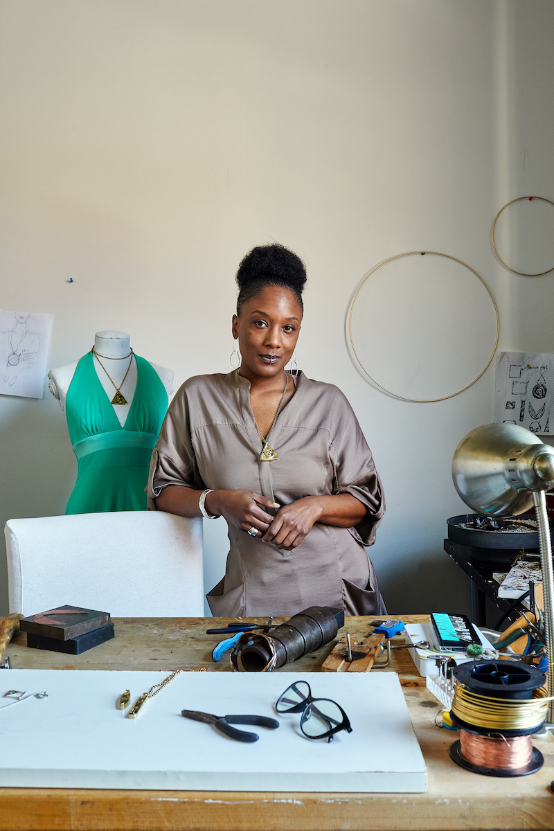 The theme of timelessness and the lineage that it evokes is at the forefront of my conversation over Zoom with Beale, who describes herself as spiritual and focuses her collections of jewelry on the broad and universal topic of “the cyclical nature of time.” Raised Christian, she also follows astrology, is interested in metaphysics, and believes in past lives and that her ancestors walk with her. This “mashup of belief systems,” as she calls it, informs her work which feels simultaneously contemporary and ancient, drawing influence from Egyptian tomb jewelry and ancient African jewelry. Beale, originally from Hartford County, Maryland, first learned about these histories of adornment as an undergraduate fine art major at MICA, but she remembers always being fascinated by jewelry. As a teenager, she saved up all her money from her first job working at McDonald’s to buy a sterling silver and quartz necklace that she put on layaway.