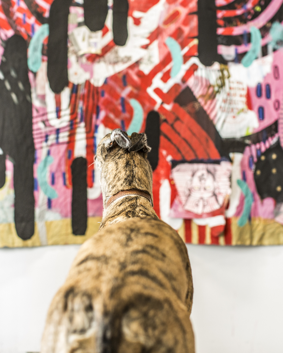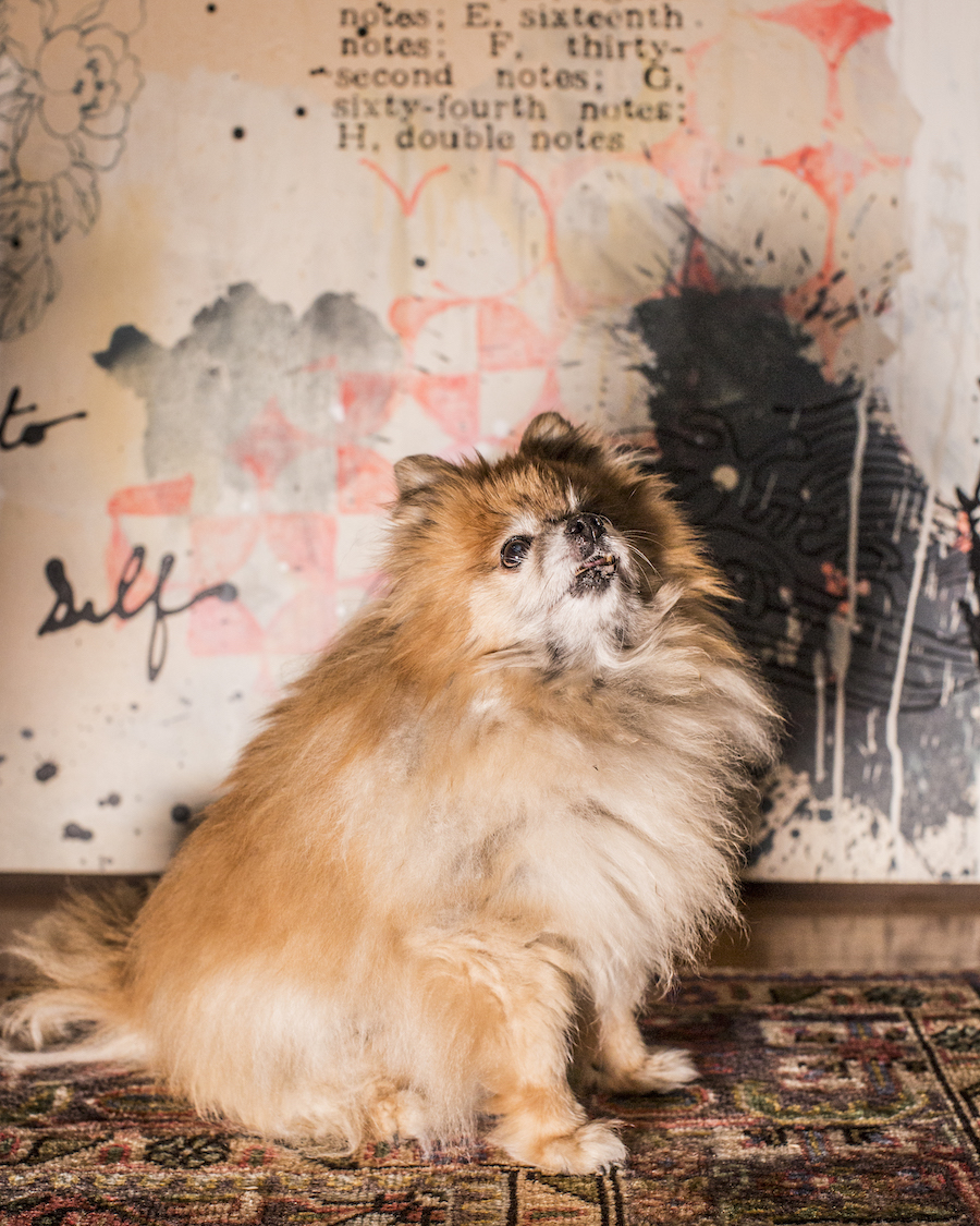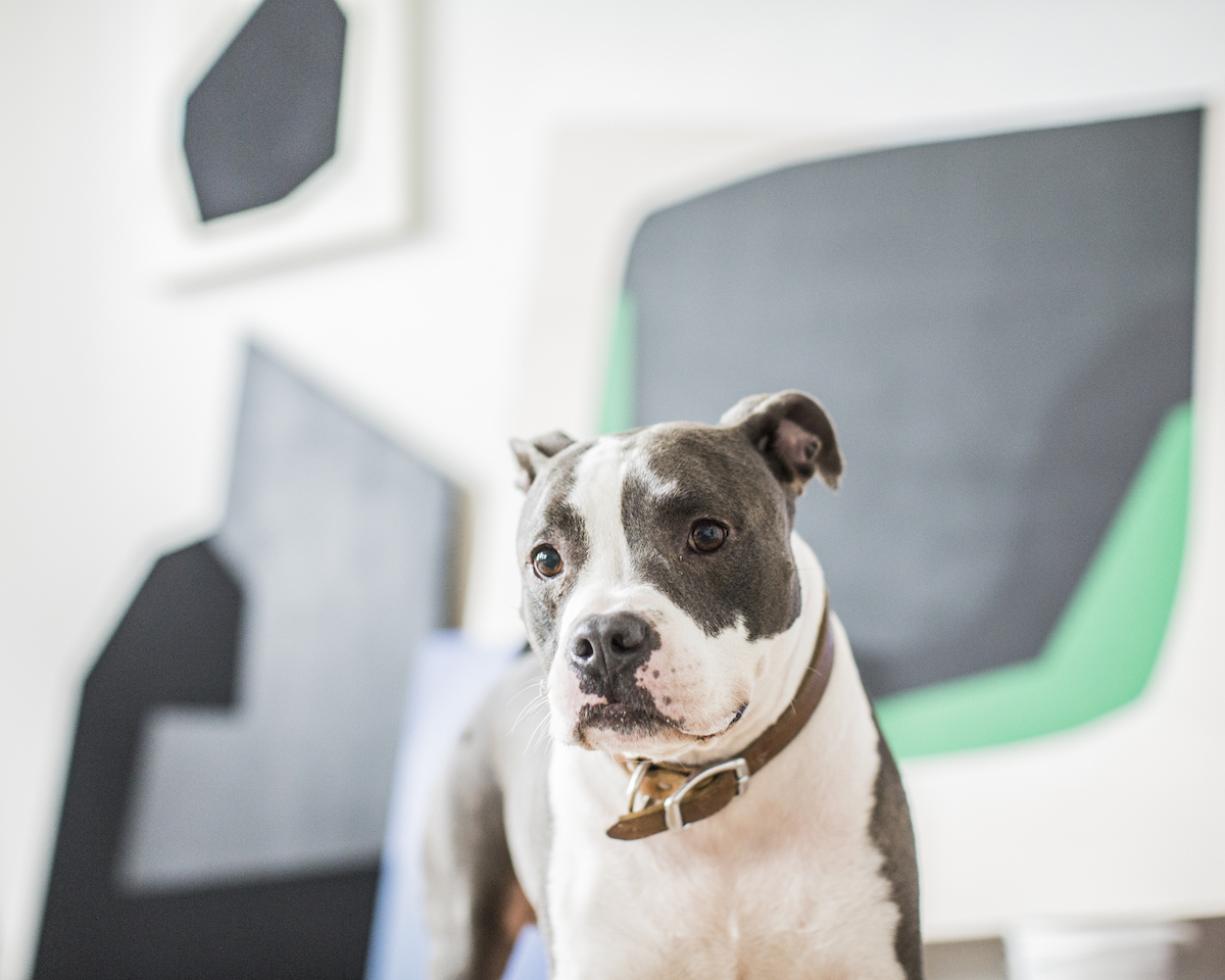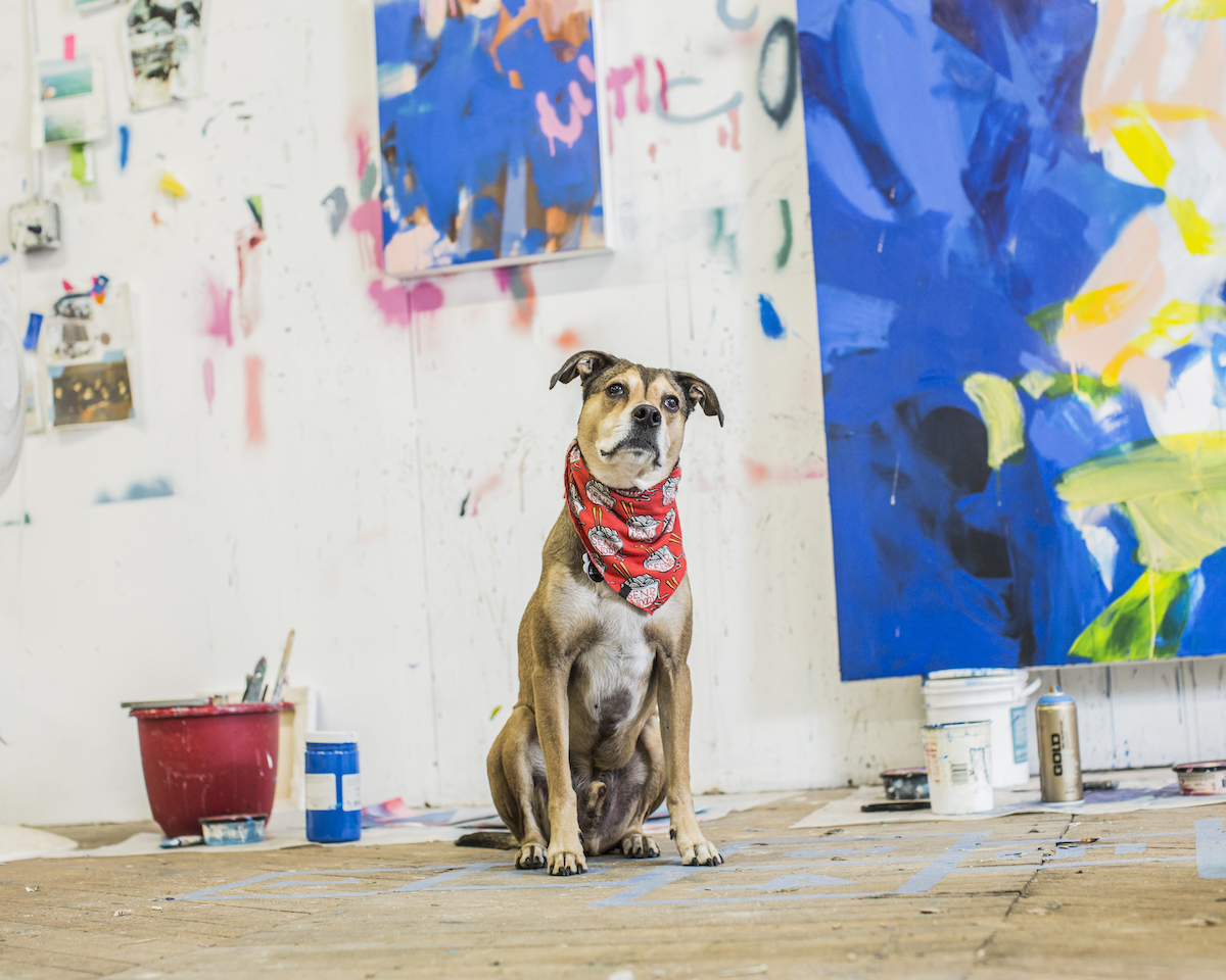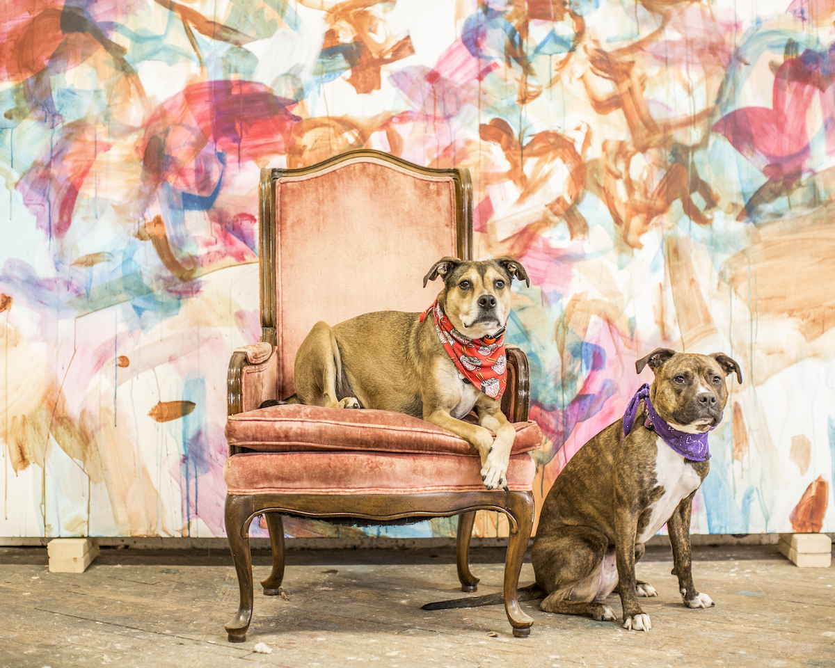 Jill Fannon photographed these art dog superstars at their creative parents’ respective homes and studios. They include Monty and Adja, Katie Pumphrey’s Pitbull mixes; Zeke, Amy Boone-McCreesh’s Mini Australian Shepherd; Theodore Roosevelt, Suzy Kopf’s ChowChow mix; Mr. Big and Louie (now sadly deceased), Cara Ober’s rescue Chihuahua and elderly Pomeranian; Kiki and Ghost Eye, Phaan Howng and Malcolm Majer’s Carolina Dog/American dingo mixes; Murray, Alex Ebstein’s Puggle mix; Biggie, Emma Childs’ English Staffordshire Bull Terrier rescue; Leica, Jackie Milad’s Greyhound rescue; Pickle, Siân Evans’ Pitbull mix; Ansel, Micah Woods’ Weimaraner; and Hikuri, Erick A. Benitez and Ariel Foster’s Mexican Husky.