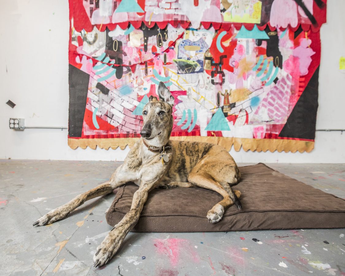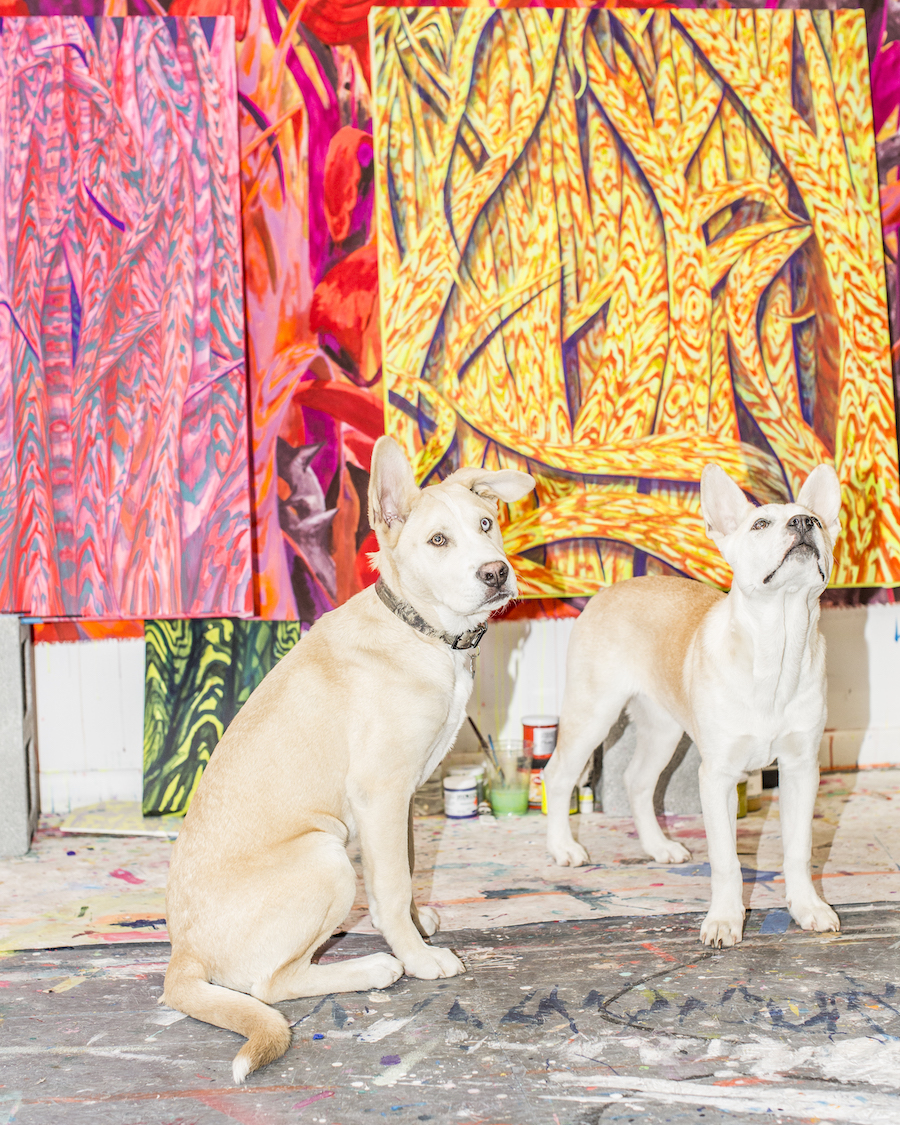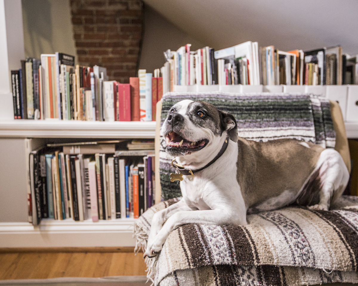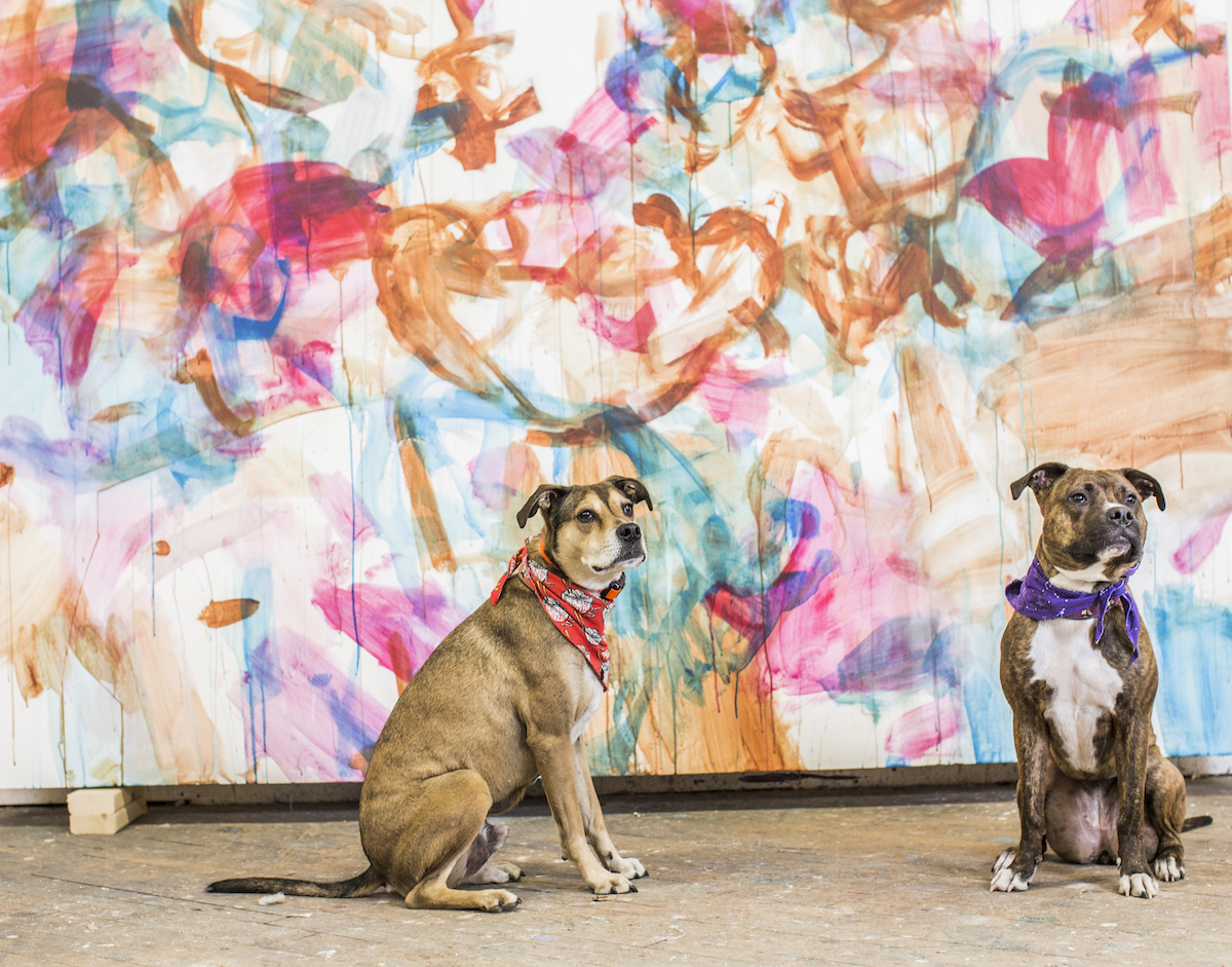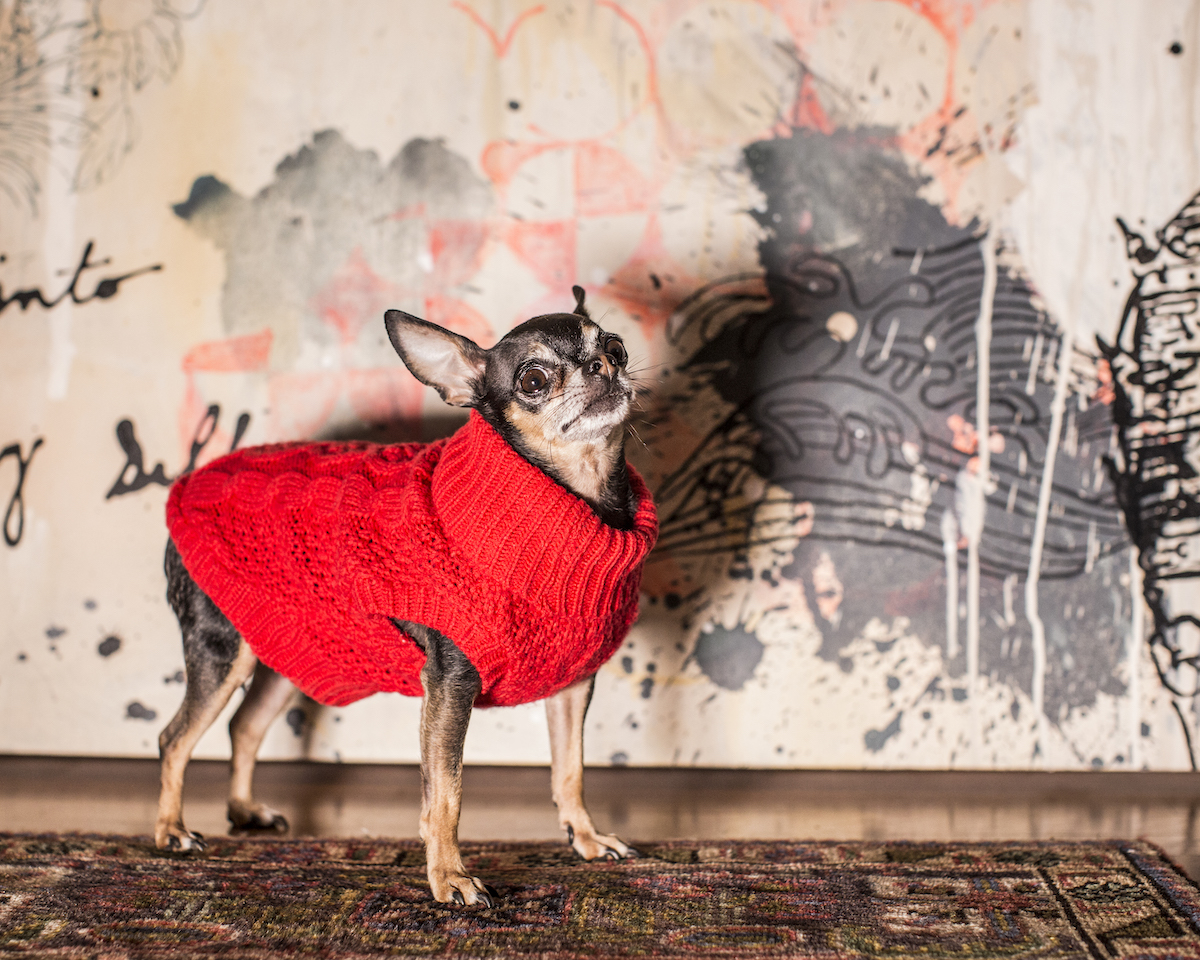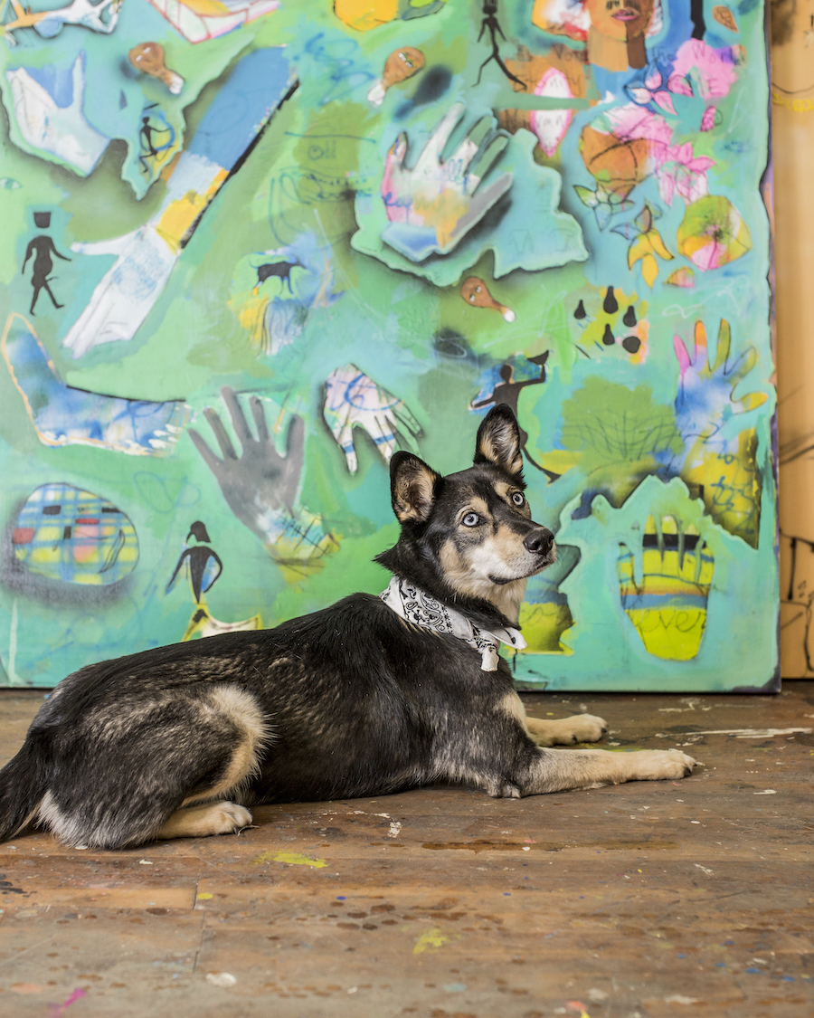 Jill Fannon photographed these art dog superstars at their creative parents’ respective homes and studios. They include Monty and Adja, Katie Pumphrey’s Pitbull mixes; Zeke, Amy Boone-McCreesh’s Mini Australian Shepherd; Theodore Roosevelt, Suzy Kopf’s ChowChow mix; Mr. Big and Louie (now sadly deceased), Cara Ober’s rescue Chihuahua and elderly Pomeranian; Kiki and Ghost Eye, Phaan Howng and Malcolm Majer’s Carolina Dog/American dingo mixes; Murray, Alex Ebstein’s Puggle mix; Biggie, Emma Childs’ English Staffordshire Bull Terrier rescue; Leica, Jackie Milad’s Greyhound rescue; Pickle, Siân Evans’ Pitbull mix; Ansel, Micah Woods’ Weimaraner; and Hikuri, Erick A. Benitez and Ariel Foster’s Mexican Husky.