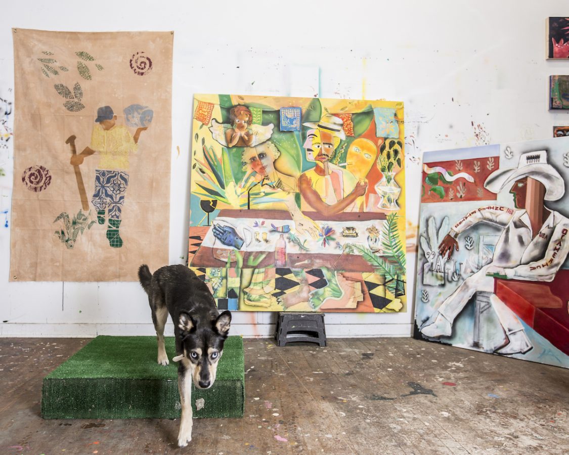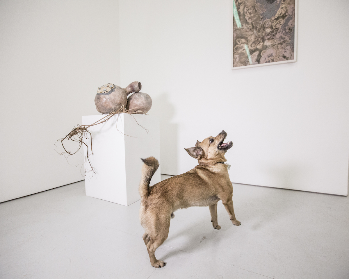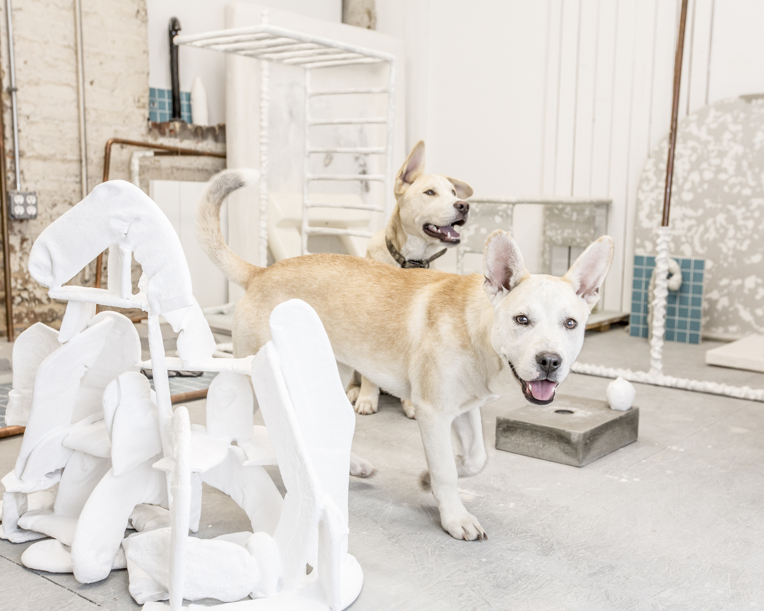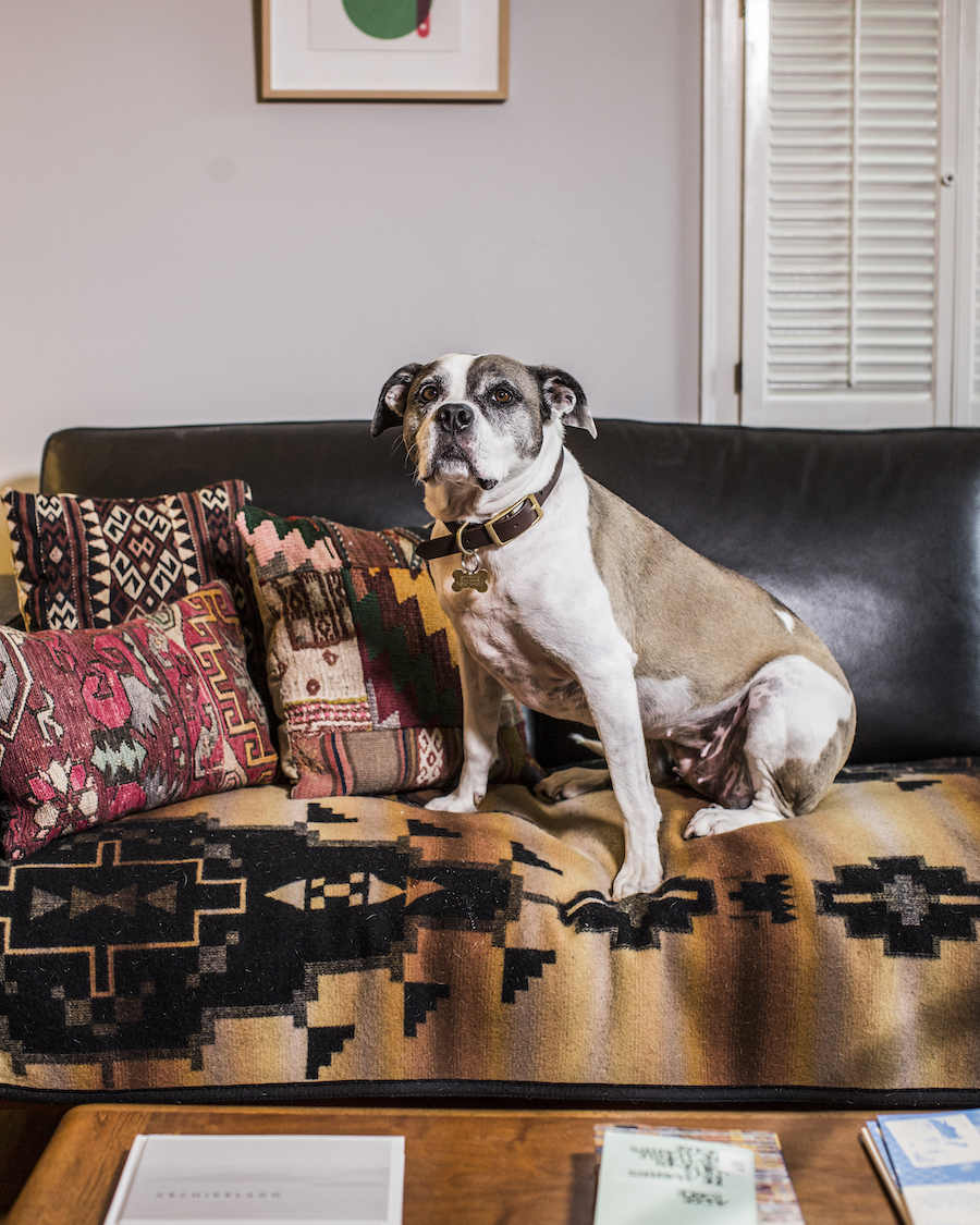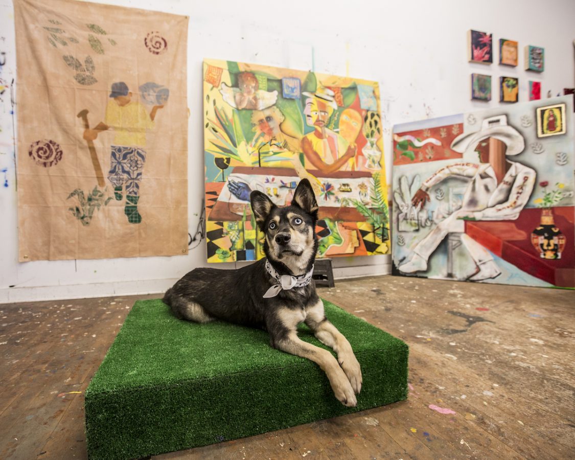 Jill Fannon photographed these art dog superstars at their creative parents’ respective homes and studios. They include Monty and Adja, Katie Pumphrey’s Pitbull mixes; Zeke, Amy Boone-McCreesh’s Mini Australian Shepherd; Theodore Roosevelt, Suzy Kopf’s ChowChow mix; Mr. Big and Louie (now sadly deceased), Cara Ober’s rescue Chihuahua and elderly Pomeranian; Kiki and Ghost Eye, Phaan Howng and Malcolm Majer’s Carolina Dog/American dingo mixes; Murray, Alex Ebstein’s Puggle mix; Biggie, Emma Childs’ English Staffordshire Bull Terrier rescue; Leica, Jackie Milad’s Greyhound rescue; Pickle, Siân Evans’ Pitbull mix; Ansel, Micah Woods’ Weimaraner; and Hikuri, Erick A. Benitez and Ariel Foster’s Mexican Husky.