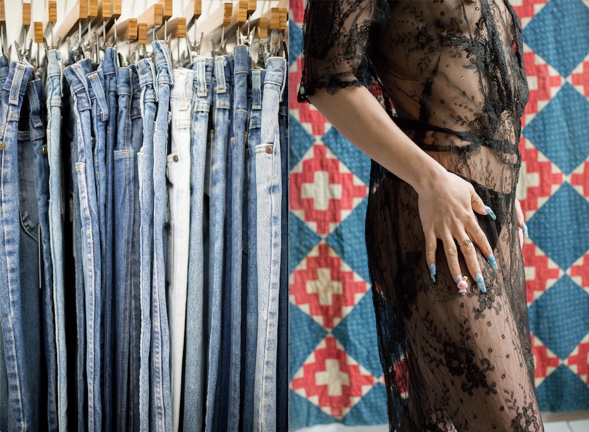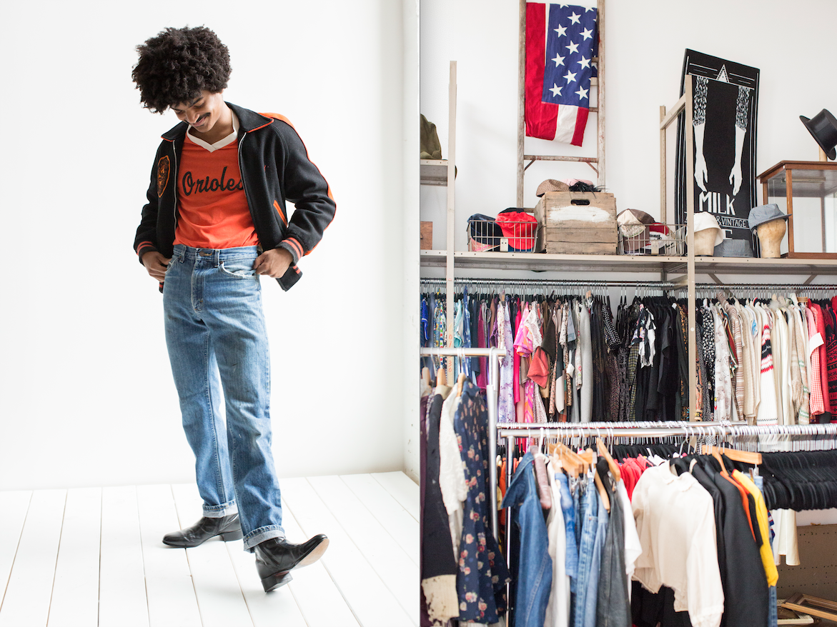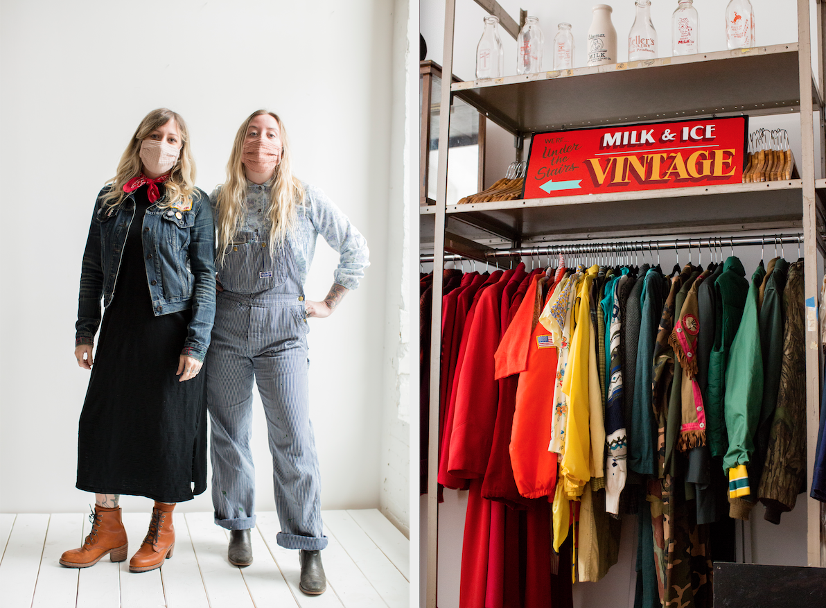 Milk & Ice started out as a co-op booth in the now-defunct Hampden Antique Mall in 2012, but then expanded to a storefront on The Avenue hosted with Christian Sturgis from 2013 to 2020. When the pandemic hit, Milk & Ice moved their operations to a private Woodberry studio, previously used to store and process—wash, mend, organize, photograph, research, price, and tag—their growing collection. They decided to close the retail aspect and use their studio as a main hub instead, focusing on selling online, with private appointments to sell on a one-on-one basis. In the fall of 2021, Milk & Ice plans to move their operation to the Northeast Baltimore area where Gavin and Schult both live, with a new storefront on Harford Road in Lauraville. They plan to use the space as a private studio during most weekdays, processing, photographing, buying vintage, and offering private shopping appointments, and then open to the public on weekends.