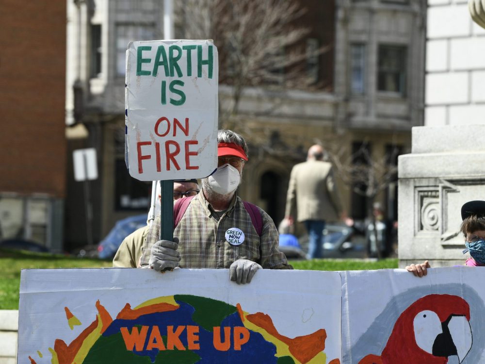 New Yorkers take action in Albany for an economic recovery and infrastructure package prioritizing climate, care, jobs, and justice, call on congress to pass the THRIVE act on April 7, 2021 in Albany, New York. (Photo by Dave Kotinsky/Getty Images for Green New Deal Network)