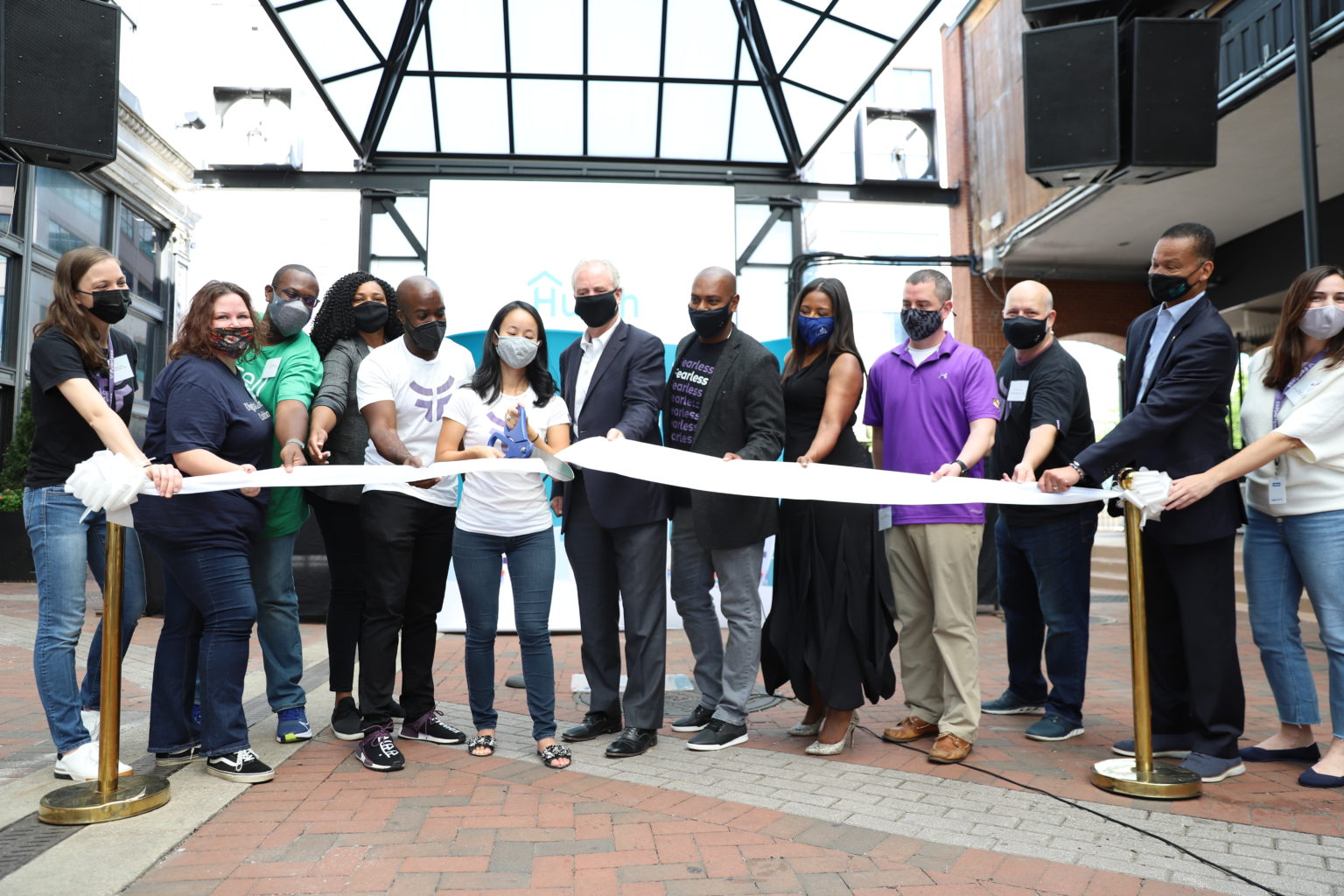 Stephanie Chin, program manager at the Hutch business incubator, on Sept. 7 cuts the ribbon at the opening of Hutch’s new meeting and co-working spaces at Power Plant Live!. Chin is joined by Hutch co-founders Delali Dzirasa and John Foster, U.S. Sen. Chris Van Hollen, and other members of the Hutch community. Photo courtesy of Hutch.