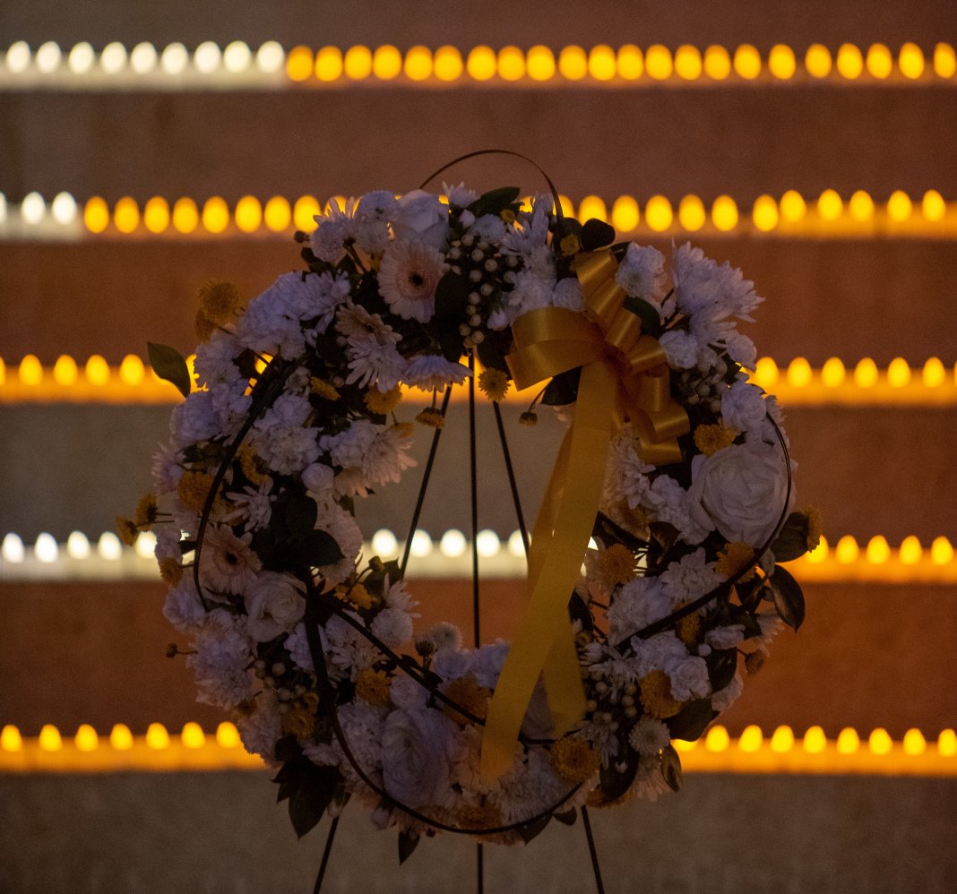 A wreath was placed in front of candles honoring those who died from COVID-19 at a State House memorial on March 5, 2021, the one-year anniversary of the first reported coronavirus cases in Maryland. On Thursday, the state reported that more than 10,000 Marylanders have died from the virus in the past 18 months. Photo from the Executive Office of the Governor.