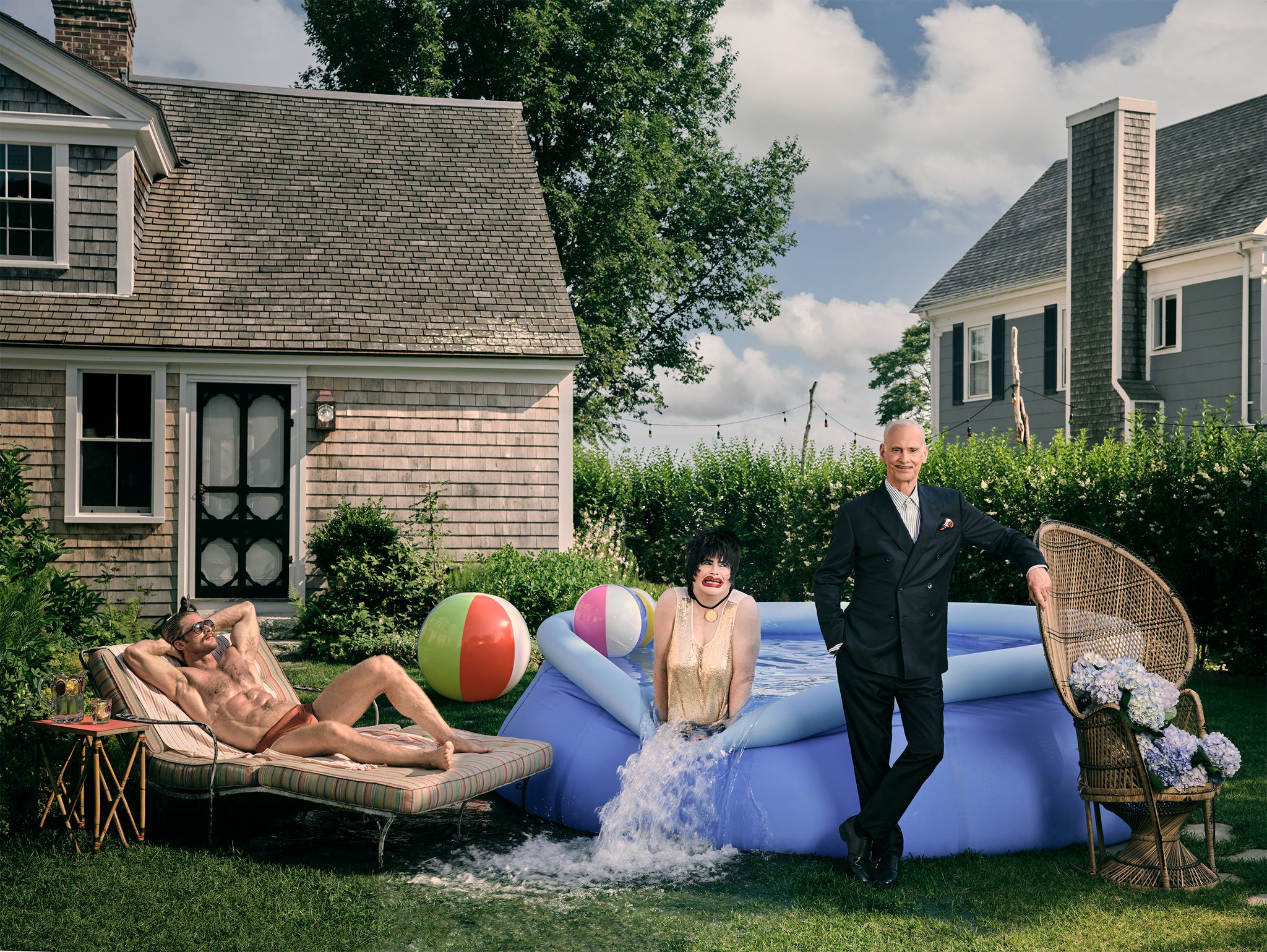 Header image: The model Matthew Dubbe, the performer Dina Martina, and Waters recreate a classic Slim Aarons image. photo by Douglas Friedman for Town & Country