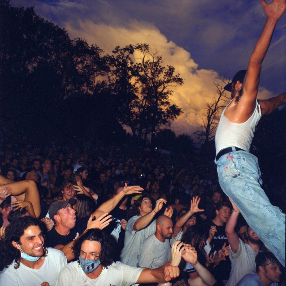 The Turnstile show on August 21 felt like a reunion. A lot of the attendees are folks I hadn’t seen since March 2020, and many of us felt a new trepidation, like the awkwardness of a first date, as we said, “I’m vaxxed, is it okay if I give you a hug?” Families and groups sat towards the back of the field in front of the Clifton Park Bandshell, and as you got closer to the stage, the crowd got thicker and younger. This was the release party for Turnstile’s latest project, GLOW ON, and the kickoff for their fall tour. It was also their first show in Baltimore in a year.