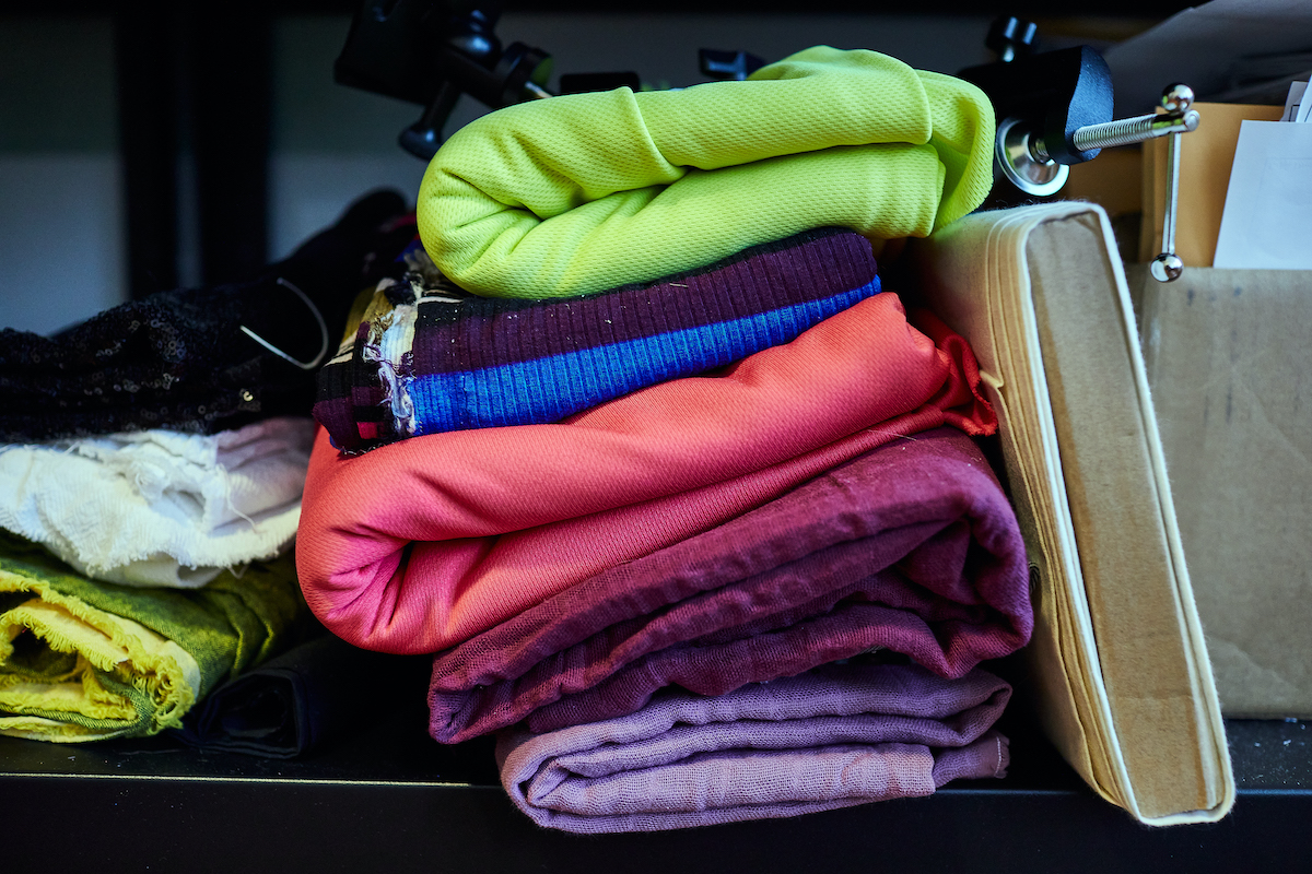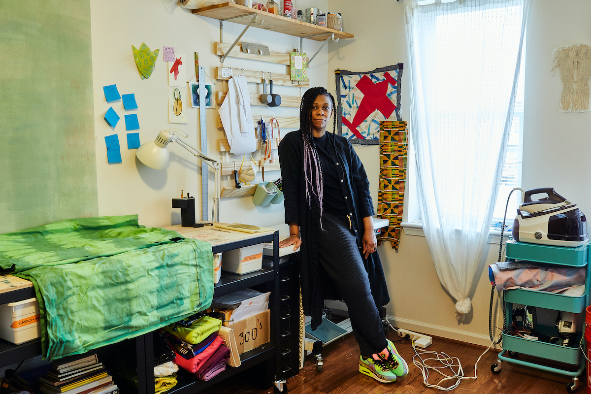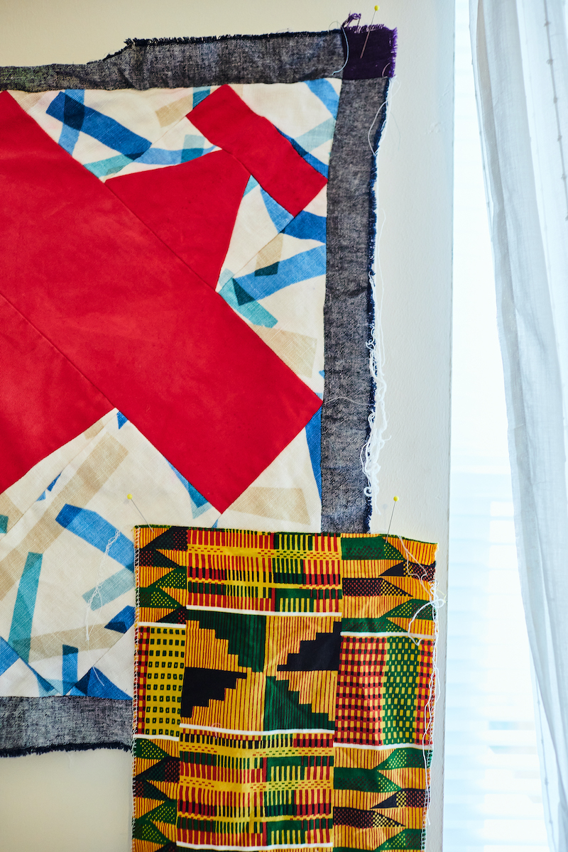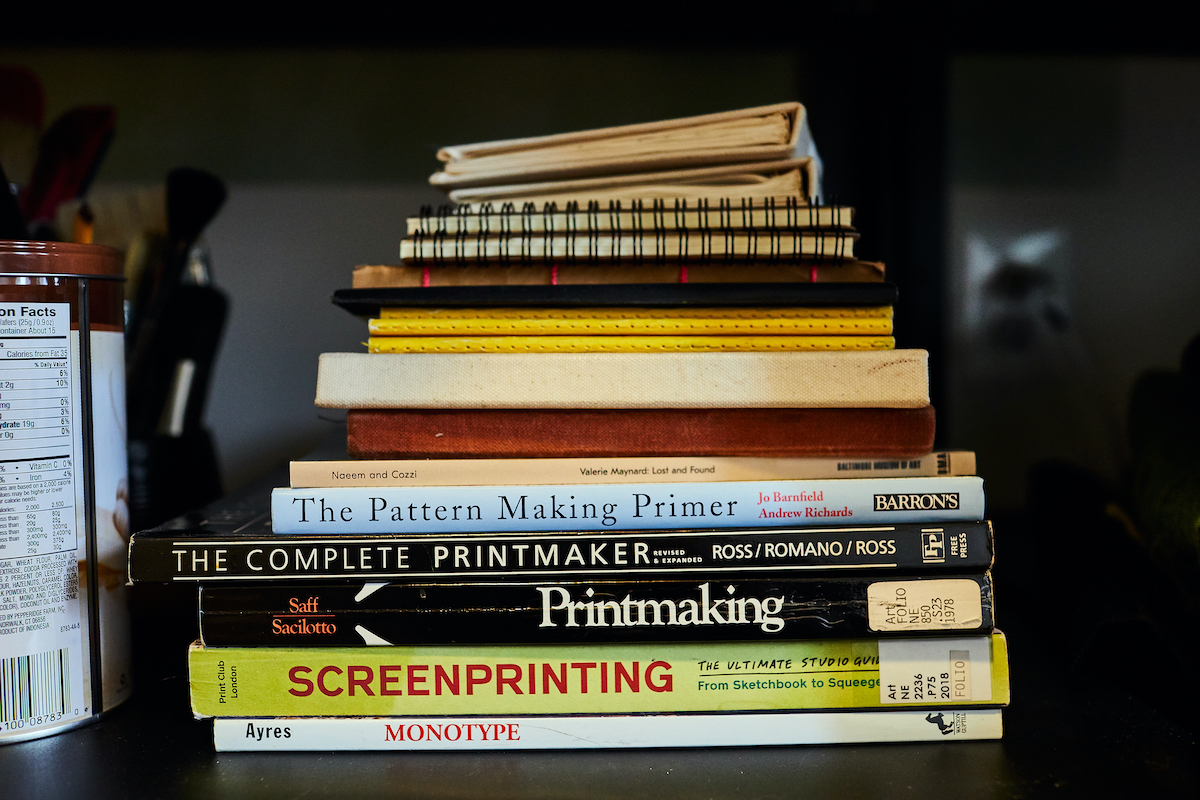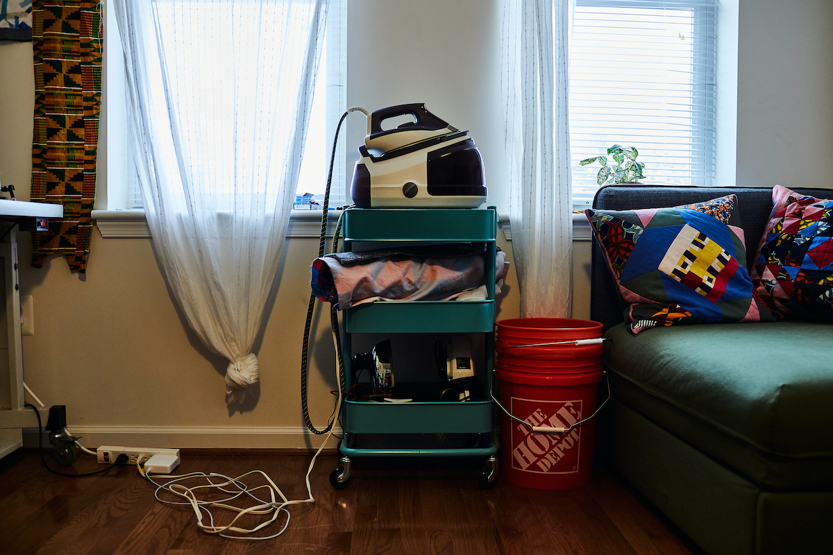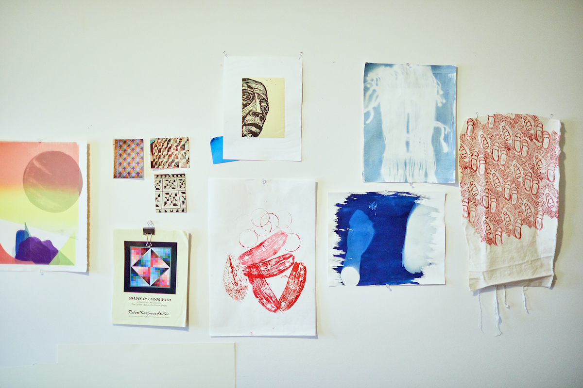 The interdisciplinary artist approaches her work “from a standpoint of print theory” even though not all of her work manifests as prints. Her childhood was rooted in a matriarchal tradition of craft and DIY practices passed down to her from her mother and grandmother. Material is important for Gatlin, as it is for other practitioners who use a mixture of media and approaches in their artwork. But material is not the origin of most projects for Gatlin. Instead, “most of the time, the ideas come first,” she explains. “It’s usually an idea that won’t leave me alone. Grudgingly, I’ll do it. And then it turns out nice.” With patience and an open-ended approach, she has found a way to blend together “high and low” aesthetics alongside sewing, which is a cornerstone of her work “typically relegated to this whole other world” of craft, Gatlin explains. To elevate the way her sewn garments are discussed, she says, “sometimes I call my garments ‘paintings’ or ‘sculptures.’”